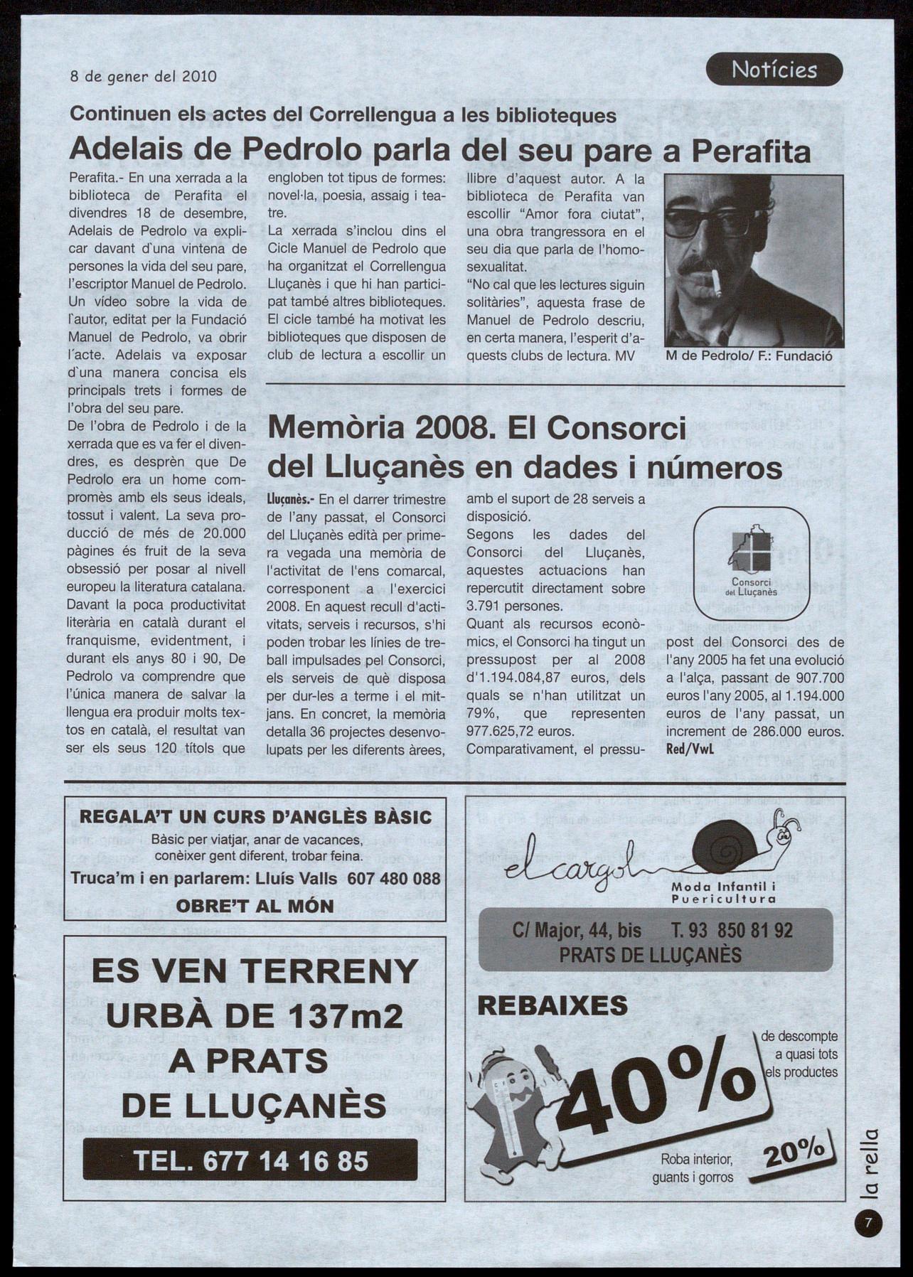 Perafita.- En una xerrada a la biblioteca de Perafita el divendres 18 de desembre, Adelais de Pedrolo va explicar davant d'una vintena de persones la vida del seu pare, l'escriptor Manuel de Pedrolo. Un vídeo sobre la vida de l'autor, editat per la Fundació Manuel de Pedrolo, va obrir l'acte. Adelais va exposar d'una manera concisa els principals trets formes de l'obra del seu pare.