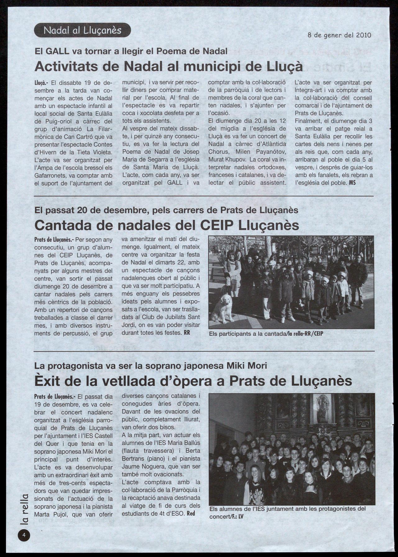 Prats de Lluçanès.- El passat dia 19 de desembre, es va celebrar el concert nadalenc organitzat a l'església parroquial de Prats de Lluçanès per l'ajuntament i l'lES Castell del Quer i que tenia en la soprano japonesa Miki Mori el principal punt d'interès. L'acte es va desenvolupar amb un extraordinari èxit amb més de tres-cents espectadors que van quedar impresCj sionats de l'actuació de la � soprano japonesa la pianista s; Marta Pujol, que van oferir e