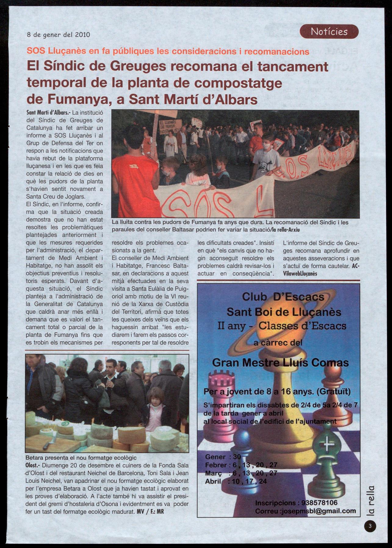 Sant Martí d'Albars.- La institució del Síndic de Greuges de Catalunya ha fet arribar un informe a SOS Lluçanès al Grup de Defensa del Ter on respon a les notificacions que havia rebut de la plataforma lluçanesa en les que es feia constar la relació de dies en què les pudors de la planta s'havien sentit novament a Santa Creu de Joglars.