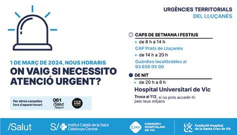 Des del passat 1 de març les urgències nocturnes d’Osona i el Lluçanès estan centralitzades, de nou, a l’Hospital Universitari de Vic. Així doncs, les persones que tinguin una urgència entre les 8 del vespre i les 8 del matí, hauran de dirigir-se a l’Hospital. En horari diürn, els serveis d’atenció medica seguiran com fins ara. Així doncs, els municipis de l’Àrea Bàsica de Salut (ABS) - Lluçanès (Prats, Olost, Sant Bartomeu, Lluçà, St. Martí, Oristà, Perafita i Merlès) entre setmana podran seguir anant al consultori municipal, si n’hi ha, o a un dels tres CAP de referència (Olost, Prats i Sant Bartomeu). Els caps de setmana i festius, de 8 del matí a 2 del migdia l’aten-