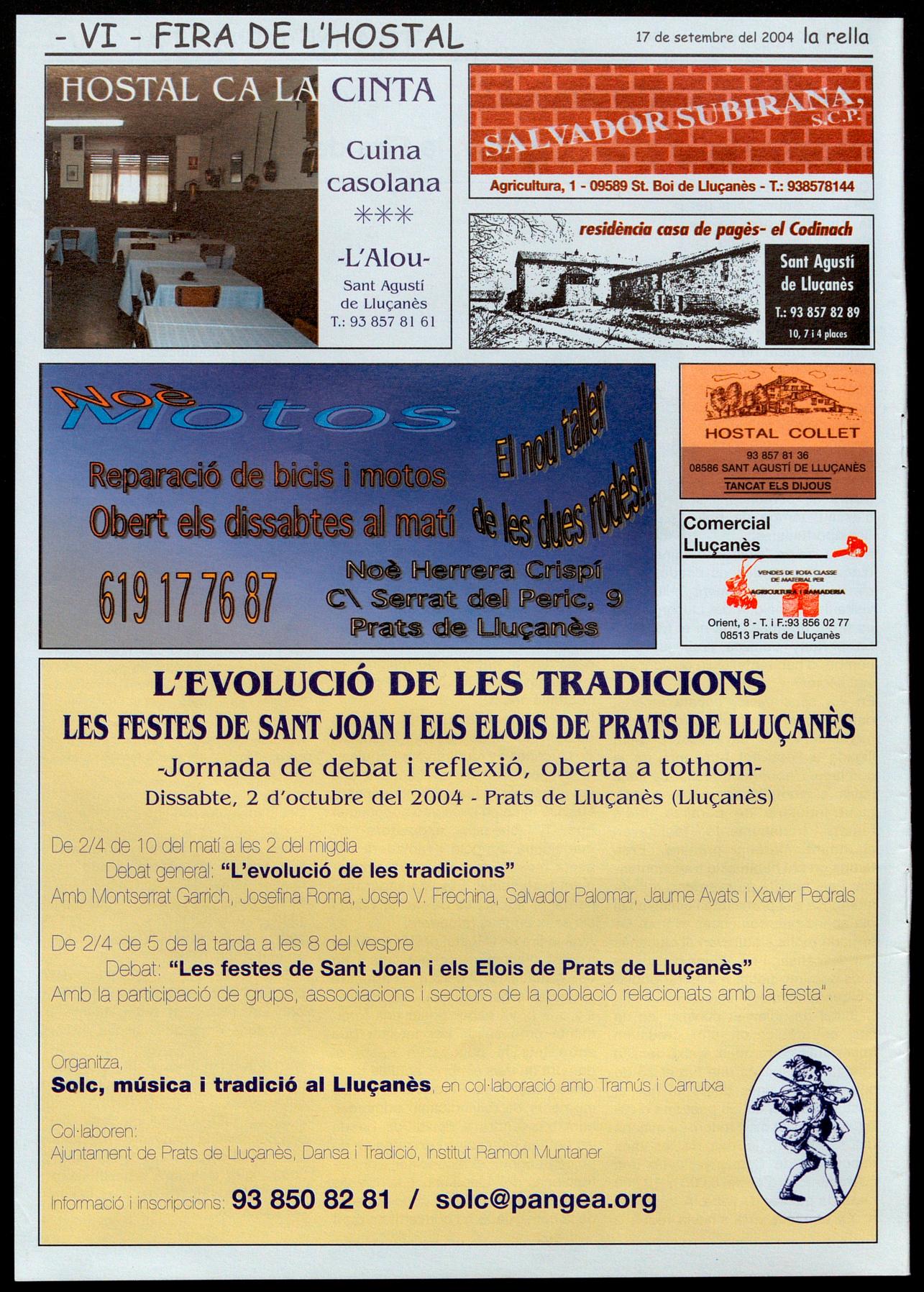 de referència de tots els 28 de setembre passi per lluçanesos, encara que la carretera que va de no tingui cap dels condíSant Quirze a Prats de cionants que la van origiLluçanès, prop del trennar, s'ha sabut adaptar cant dels Munts, es pre- als nous temps, aconseguntarà què hi fa tota guint que tots els veïns i aquella gent. I segura- veïnes de la comarca ment després d'explicar- ens hi sentim plenament li que es tracta de la Fira identificats. de l'Hostal del Vilar,