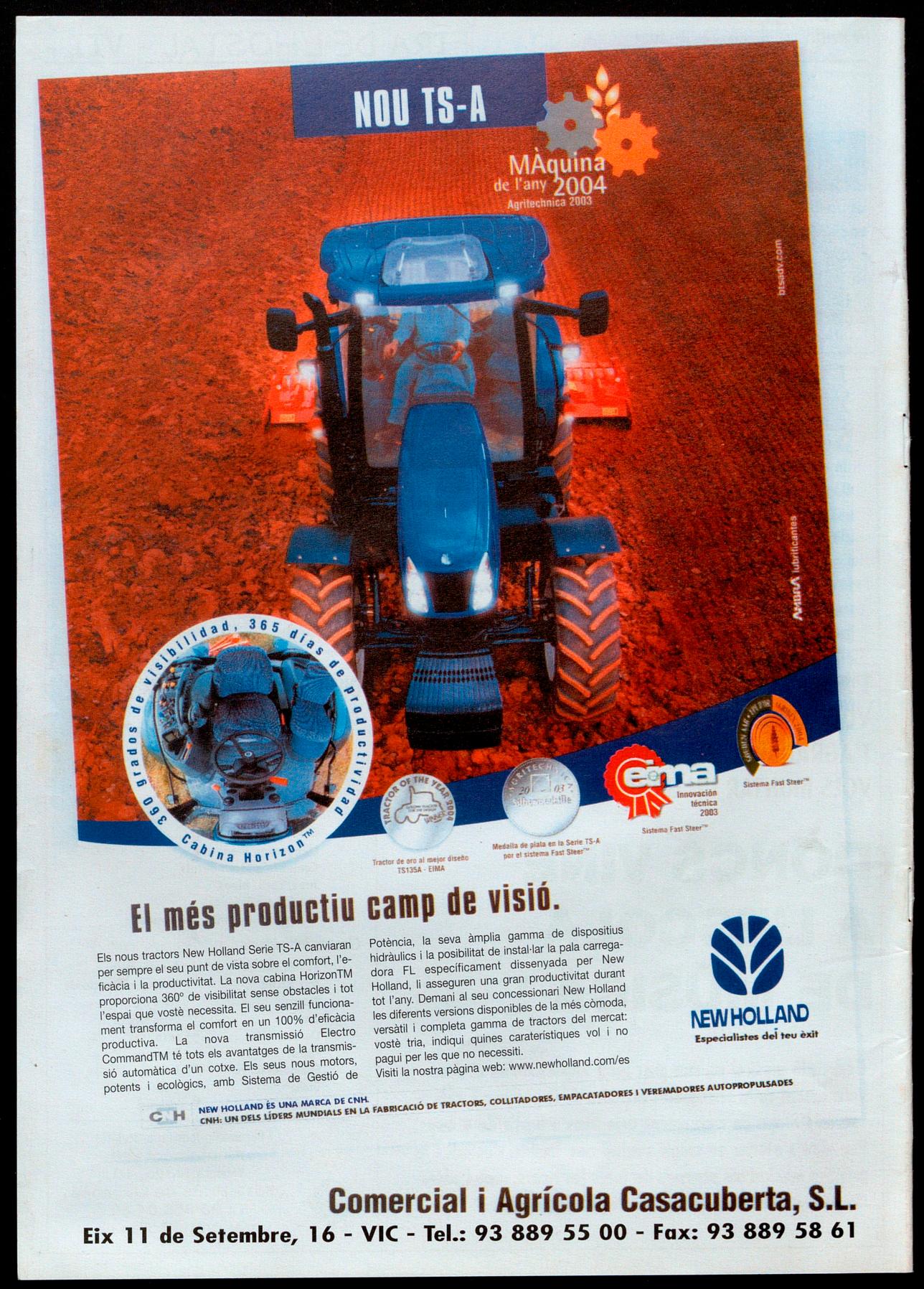 Els nous tractors New Holland Serie TS-A canviaran per sempre el seu punt de vista sobre el comfort, l'eficàcia la productivitat. La nova cabina HorizonTM proporciona 3600 de visibilitat sense obstacles i tot l'espai que vostè necessita. El seu senzill funcionament transforma el comfort en un 100% d'eficàcia productiva. La nova transmissió Electro CommandTM té tots els avantatges de la transmissió automàtica d'un cotxe. Els seus nous motors, potents ecològics, amb Sistema de Gestió de