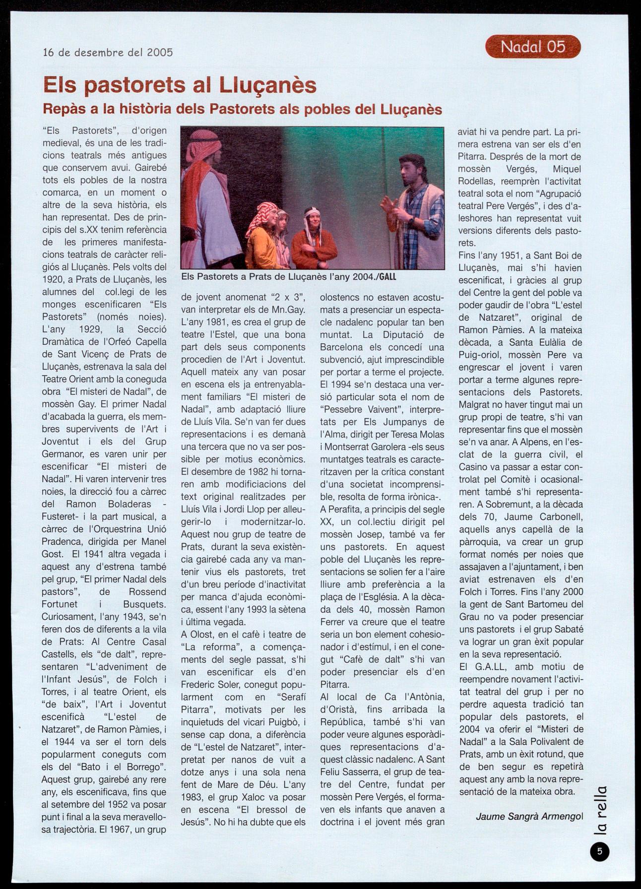 "Els Pastorets", d'origen medieval, és una de les tradicions teatrals més antigues que conservem avui. Gairebé tots els pobles de la nostra comarca, en un moment o altre de la seva història, els han representat. Des de principis del s.XX tenim referència de les primeres manifestacions teatrals de caràcter religiós al Lluçanès. Pels volts del 1920, a Prats de Lluçanès, les alumnes del col.legi de les monges escenificaren "Els Pastorets" (només noies).