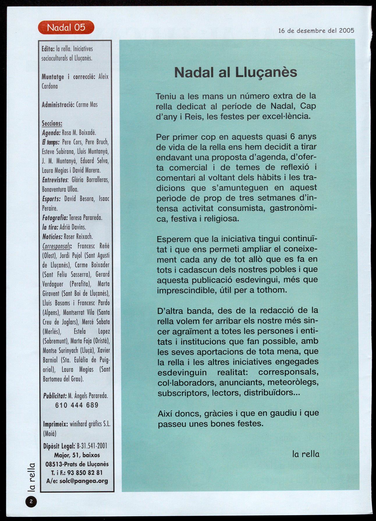 D'altra banda, des de la redacció de la rella volem fer arribar els nostre més sincer agraïment a totes les persones i entitats i institucions que fan possible, amb les seves aportacions de tota mena, que la rella i les altres iniciatives engegades esdevinguin realitat: corresponsals, col-laboradors, anunciants, meteoròlegs, subscriptors, lectors, distribuïdors