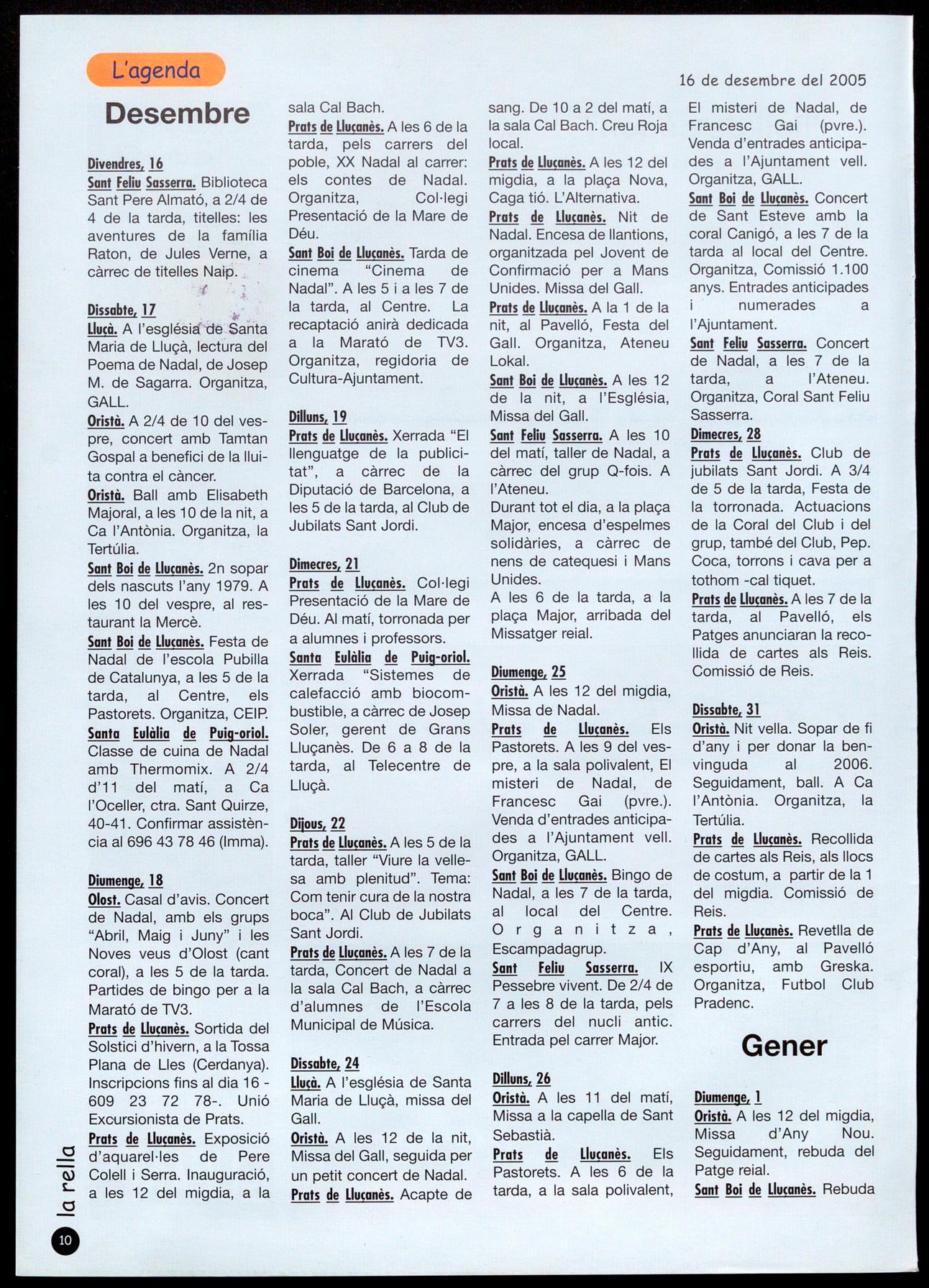 Prats de Llucanès. Col-leqi Presentació de la Mare de Déu. AI matí, torronada per a alumnes i professors. Santa Eulàlia de Puig-oriol. Xerrada "Sistemes de calefacció amb biocombustible, a càrrec de Josep Soler, gerent de Grans Lluçanès. De 6 a 8 de la tarda, al Telecentre de Lluçà.