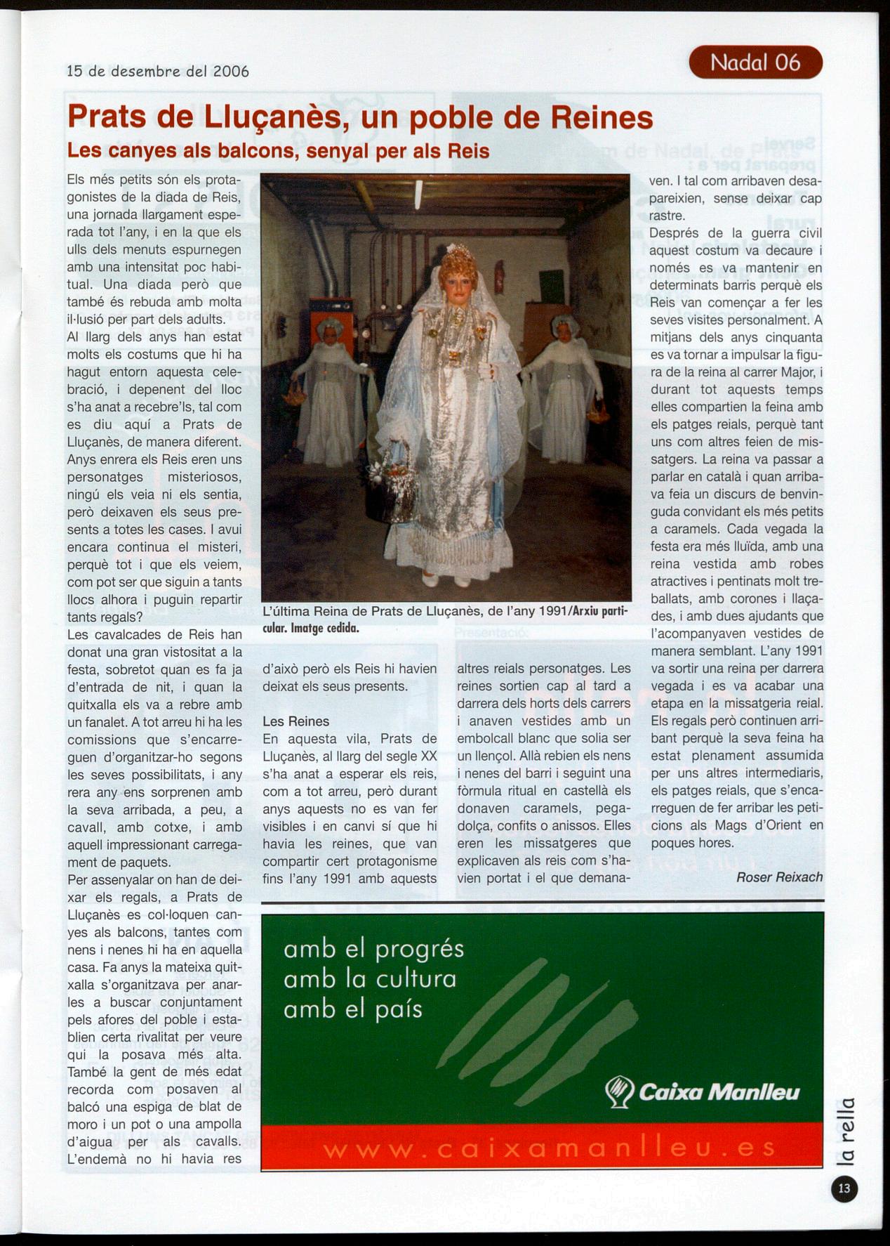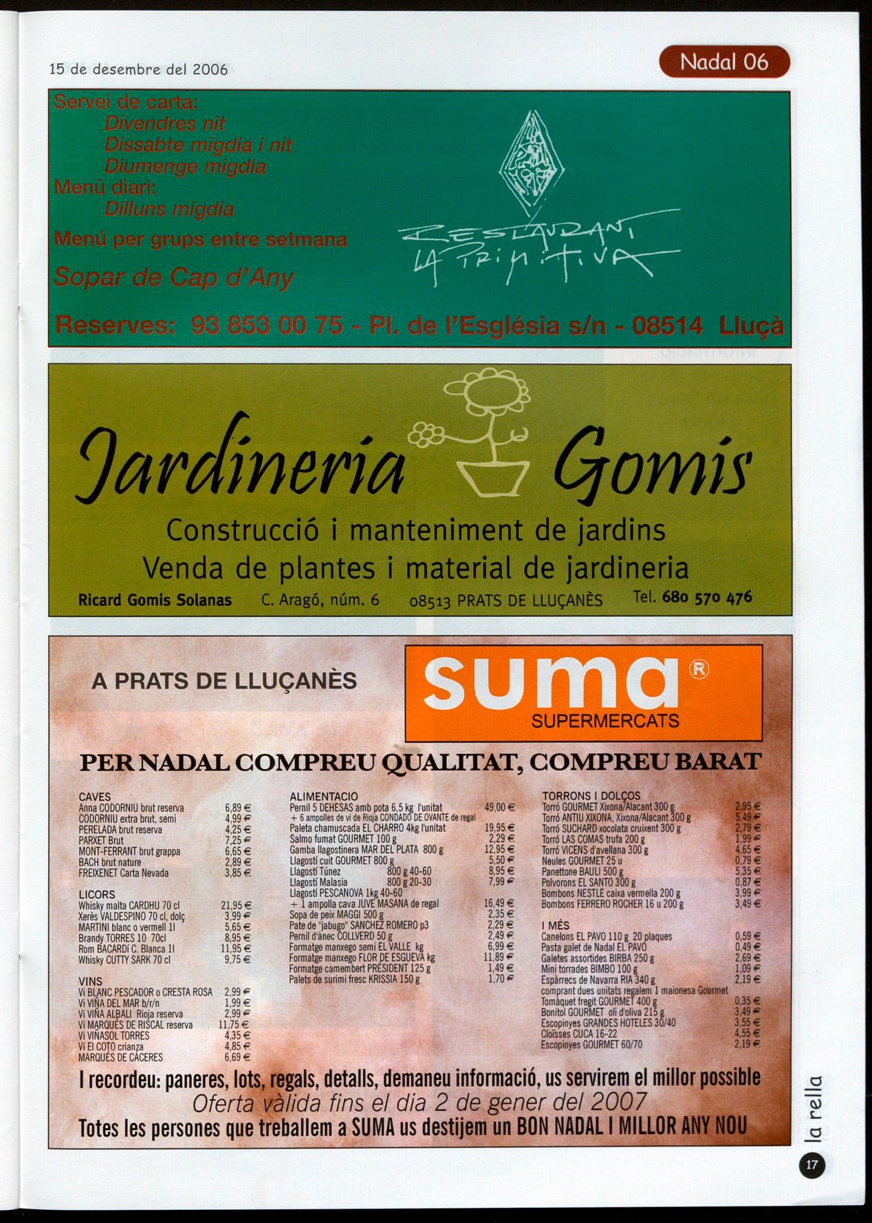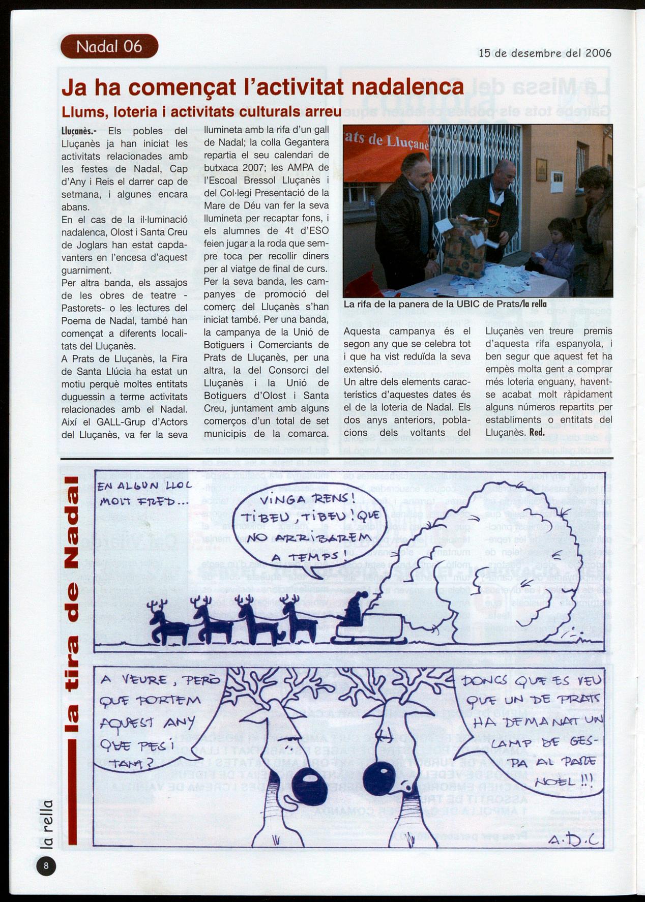 Ilumineta amb la rifa d'un gall de Nadal; la colla Gegantera repartia el seu calendari de butxaca 2007; les AMPA de l'Escoal Bressol Lluçanès del Col-Ieqi Presentació de la Mare de Déu van fer la seva Ilumineta per recaptar fons, els alumnes de 4t d'ESO feien jugar a la roda que sempre toca per recollir diners per al viatge de final de curs. Per la seva banda, les campanyes de promoció del comerç del Lluçanès s'han iniciat també. Per una banda, la campanya de la Unió de Botiguers i Comerciants de Prats de Lluçanès, per una altra, la del Consorci del Lluçanès la Unió de Botiguers d'Olost i Santa Creu, juntament amb alguns comerços d'un total de set municipis de la comarca.