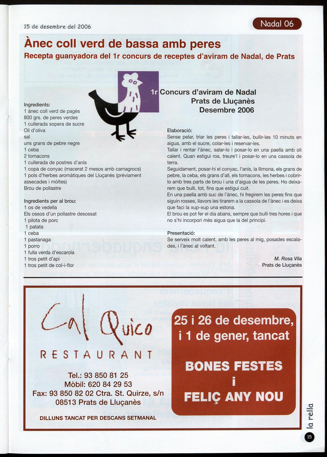 Prats de Lluçanès.- Dins deis actes de la Fira de Santa Llúcia 2006, hi havia programat el "I Concurs de Receptes de Cuina d'Aviram de Nadal", els premis del qual es van atorgar dissabte, dia 9 de desembre, després de la Taula Rodona dedicada a l'aviram de Nadal.