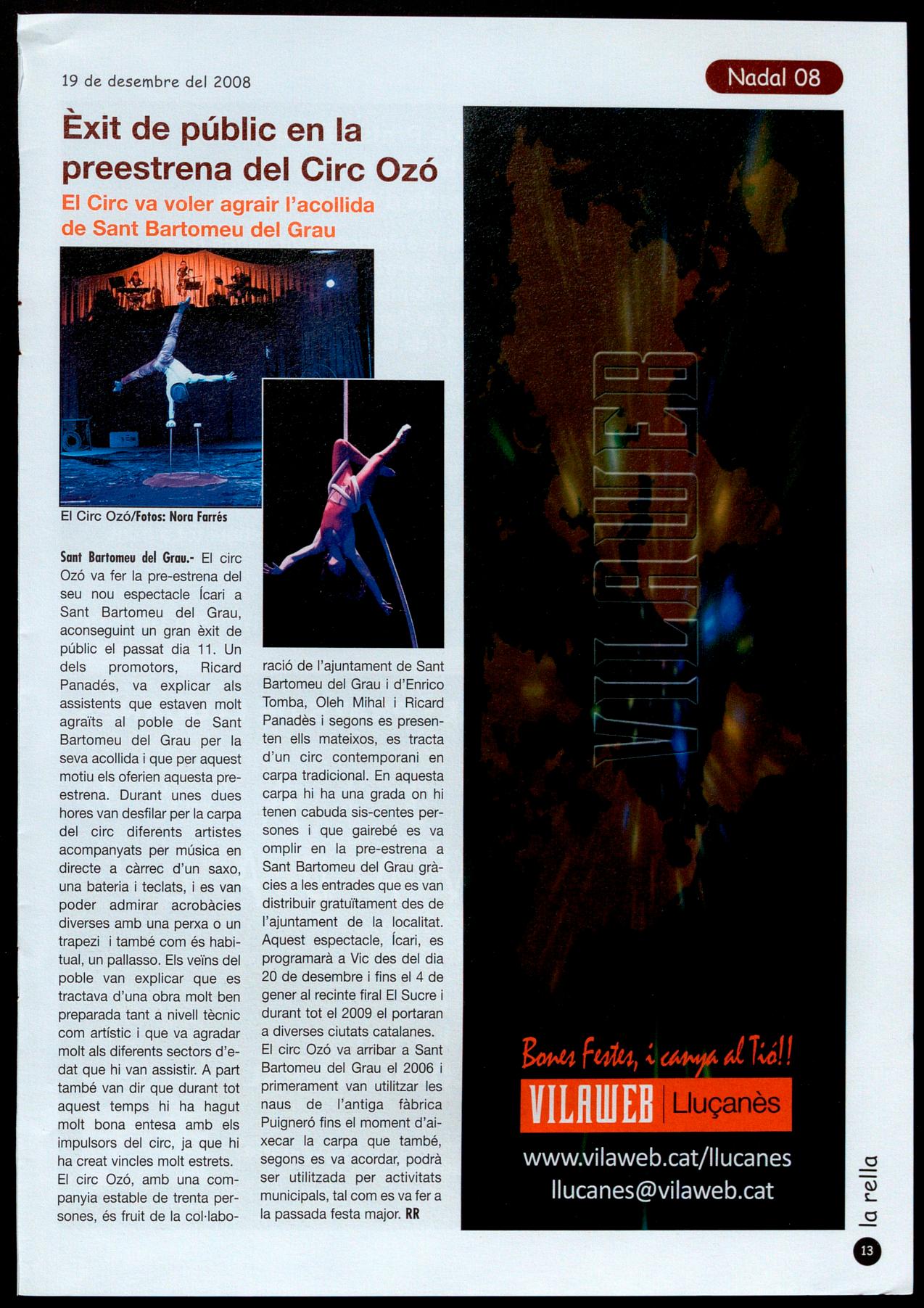 Sant Bartomeu del Grau.- El circ Ozó va fer la pre-estrena del seu nou espectacle ícari a Sant Bartomeu del Grau, aconseguint un gran èxit de públic el passat dia 11. Un dels promotors, Ricard Panadés, va explicar als assistents que estaven molt agraïts al poble de Sant Bartomeu del Grau per la seva acollida que per aquest motiu els oferien aquesta preestrena. Durant unes dues hores van desfilar per la carpa del circ diferents artistes acompanyats per música en directe a càrrec d'un saxo, una bateria teclats, es van poder admirar acrobàcies diverses amb una perxa o un trapezi i també com és habitual, un pallasso. Els veïns del poble van explicar que es tractava d'una obra molt ben preparada tant a nivell tècnic com artístic que va agradar molt als diferents sectors d'edat que hi van assistir. A part també van dir que durant tot aquest temps hi ha hagut molt bona entesa amb els impulsors del circ, ja que hi ha creat vincles molt estrets.