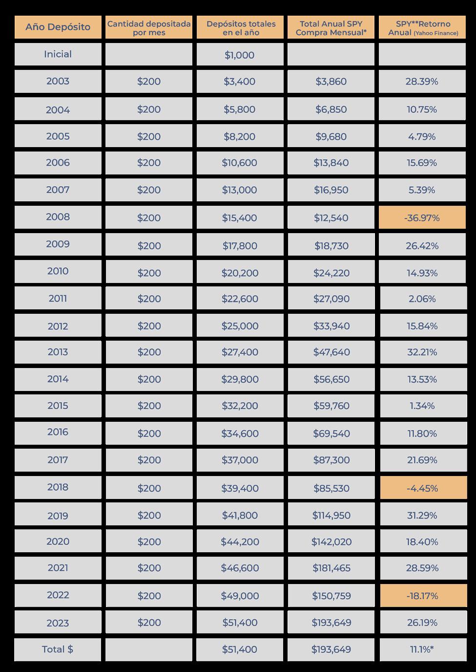 En este ejemplo, si su salario fuera de $2000 por mes y usted y su empleador aportaron cada uno un 5% después de comenzar con $1000, invertiría los $200 que se muestran en el ejemplo anterior. En los últimos 21 años esta inversión creció a más de $193,000.