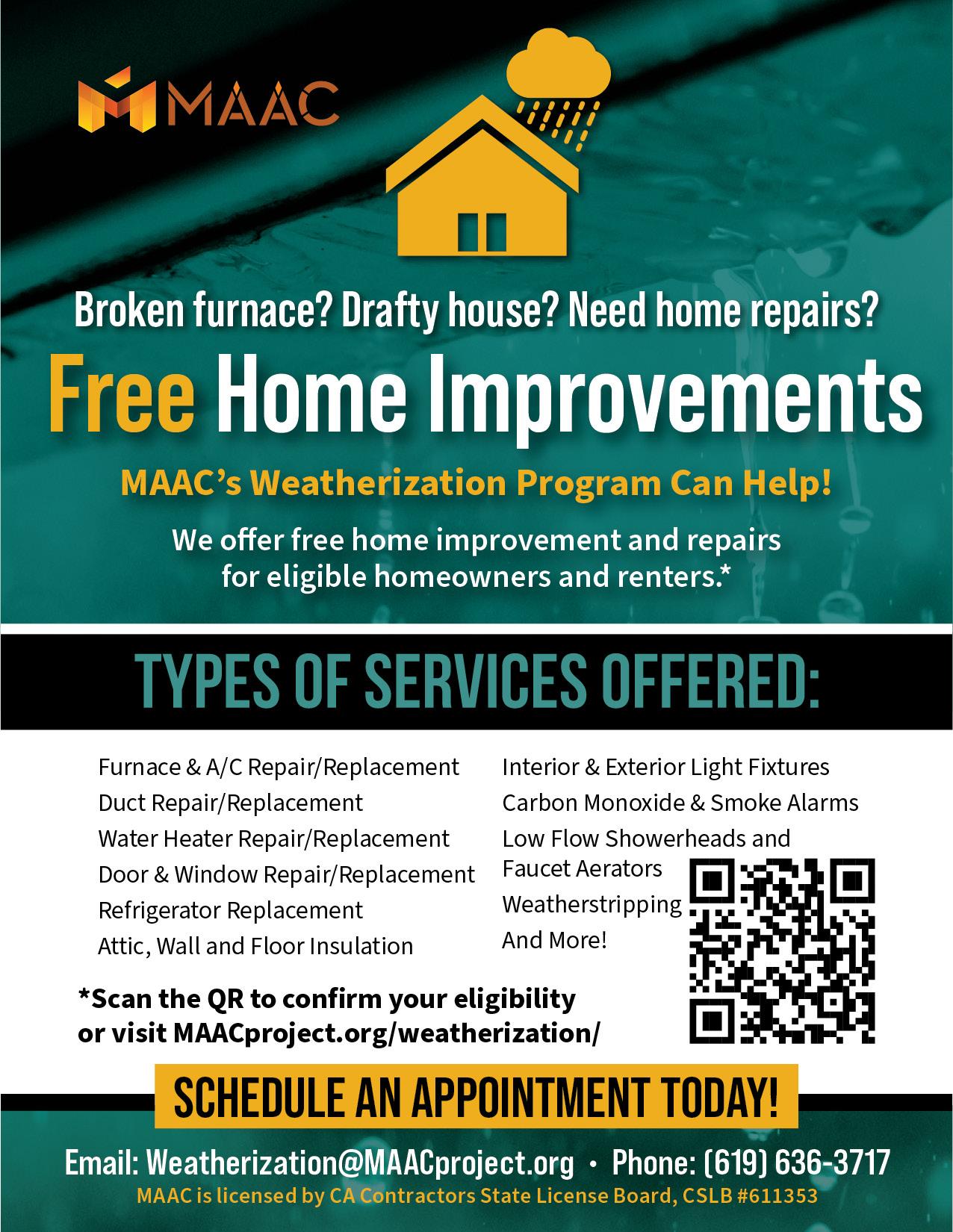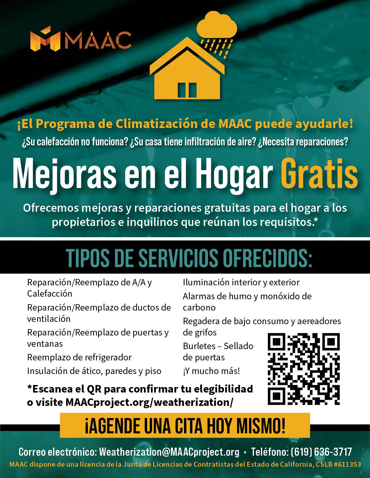 Los hogares interesados pueden llamar para acceder a estos servicios GRATUITOS. La evaluación de elegibilidad se basa en los códigos postales, ingresos y el tamaño del hogar, dando prioridad a los hogares particularmente vulnerables, como los ancianos, las personas con discapacidades o las familias con niños. Para obtener información adicional, comuníquese con los Servicios de Climatización de MAAC al (619) 409-7588.