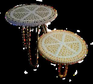 Little Tables for putting your plants on. They represent a lemon and lime slice. The tables are made of MDF, coated steel, grout and glazed ceramic tiles.