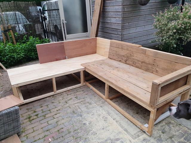 A sustainable garden bench, crafted from repurposed wood, salveged from an old desk made from scaffolded wood the bench seats five people, but can also withstand the playful energy of to fullgrown staffords.