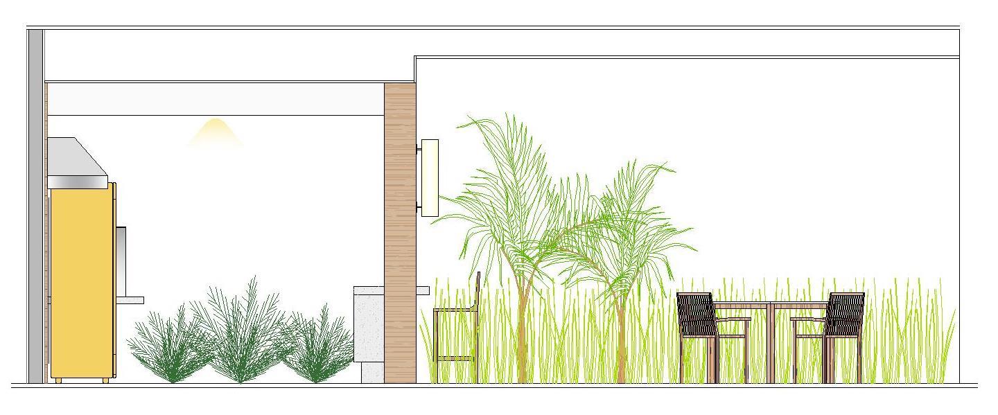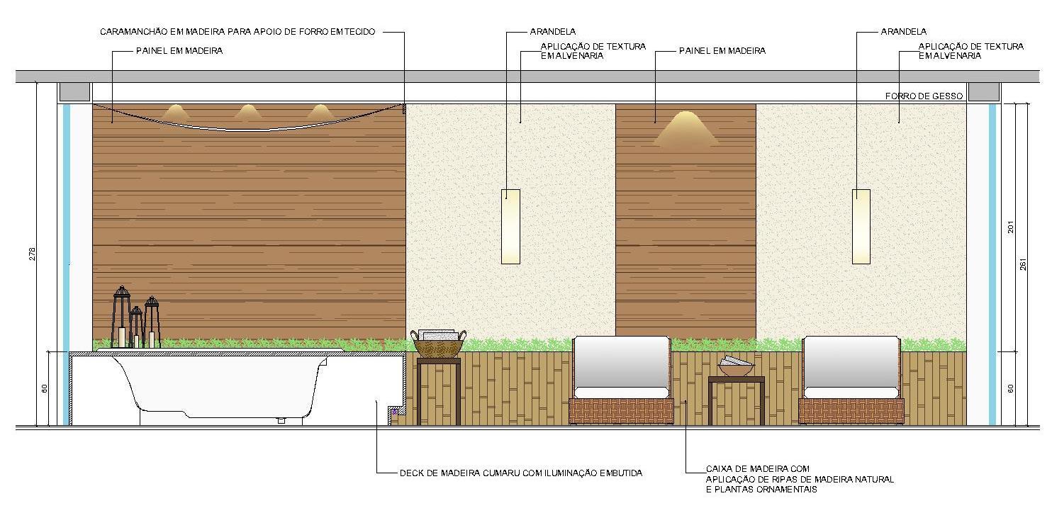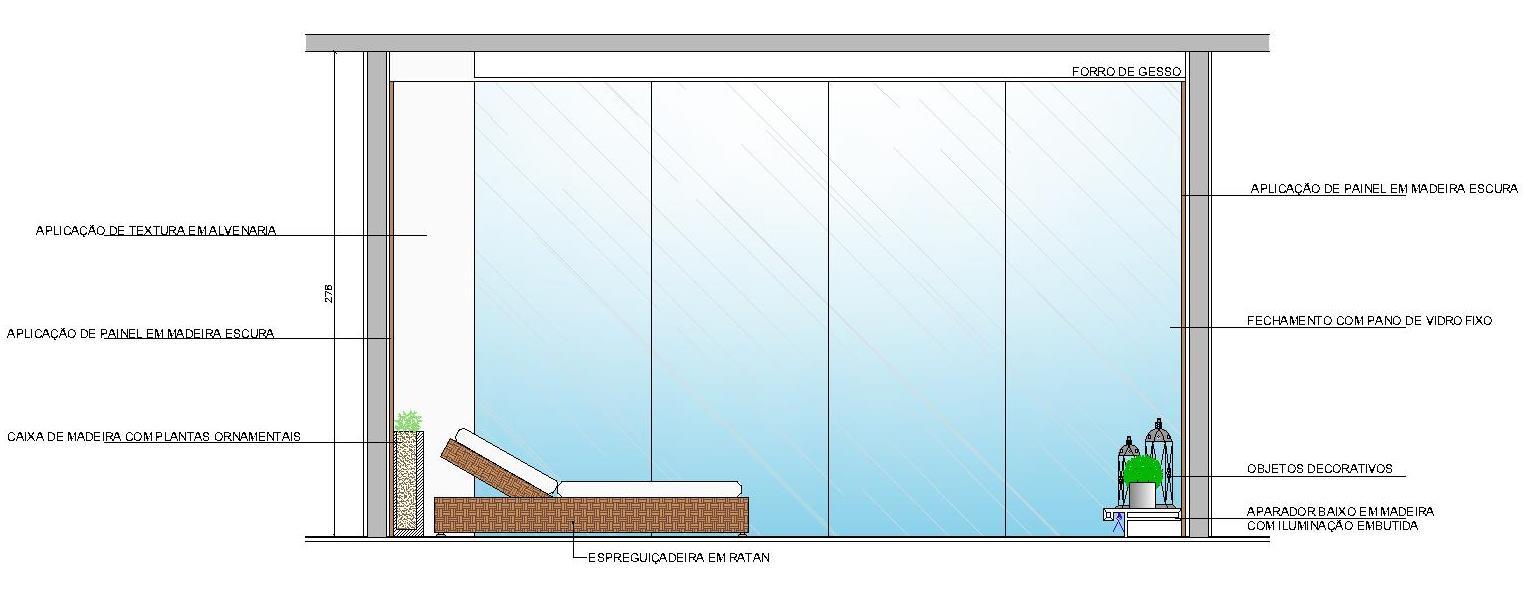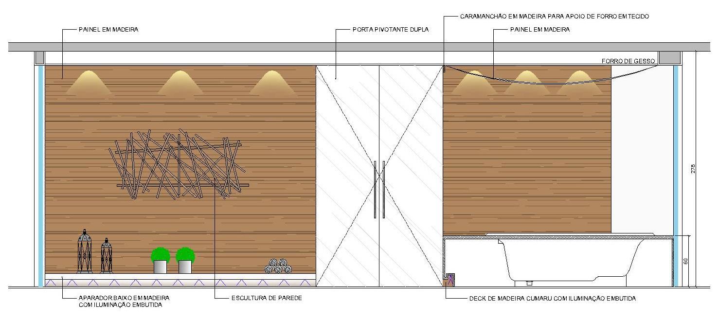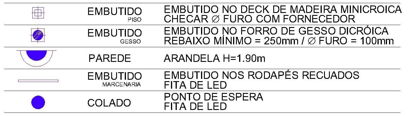 HIDRO Rodapé 10cm de altura / mesma madeira do piso (D)REV. ALVENARIAS Porcellanato Crossover ACT RET HARD RET Forest NO 15 x 120cm (E) MURETAS Revestidas de hastes de bambu PEDRAS (F)APARADOR Mármore Travertino Romano bruto levigado resinado ACABAMENTOS (G) ACABAMENTOS Deca acabamento para registro pq link PADRÃO DE ILUMINAÇÃO Spots e embutidos quadrados