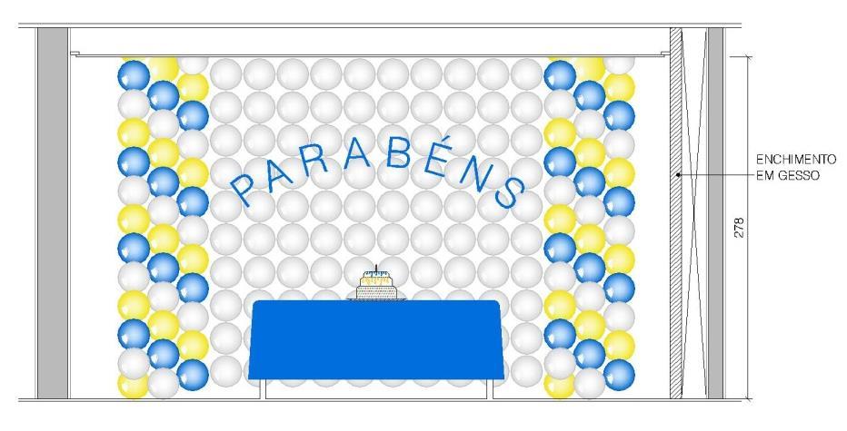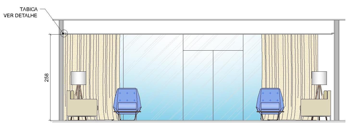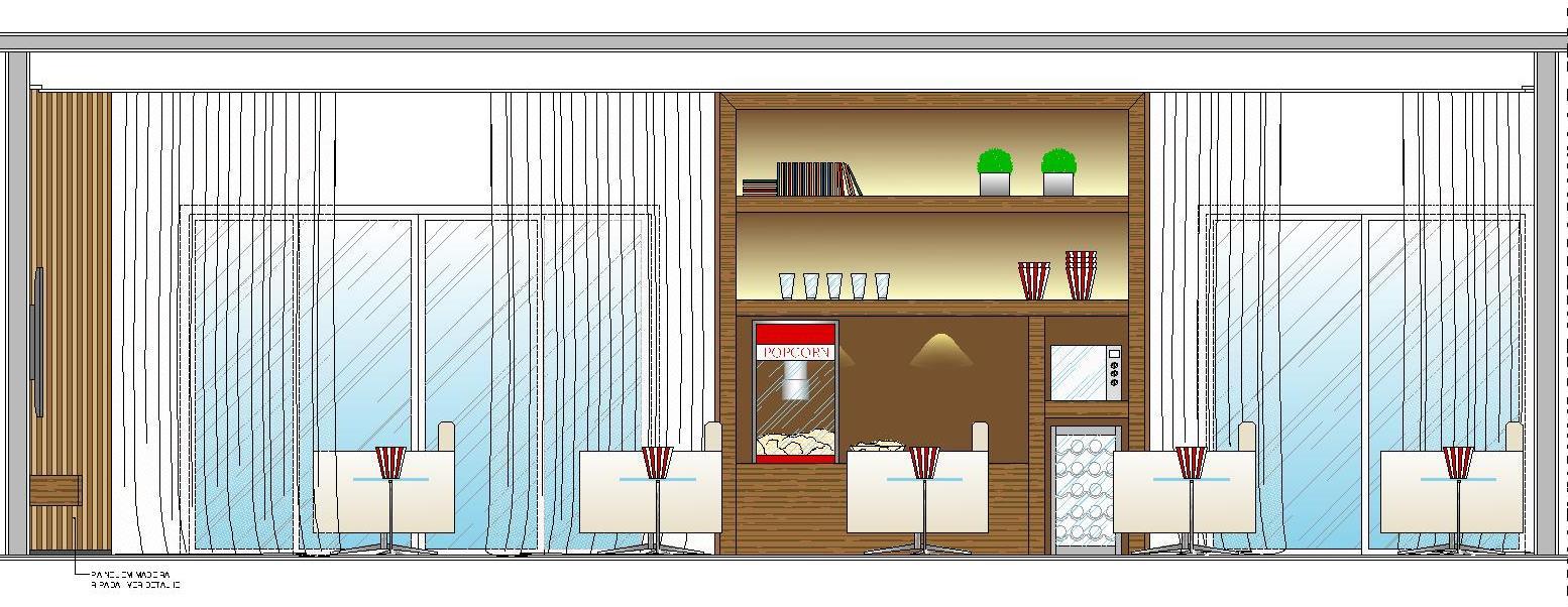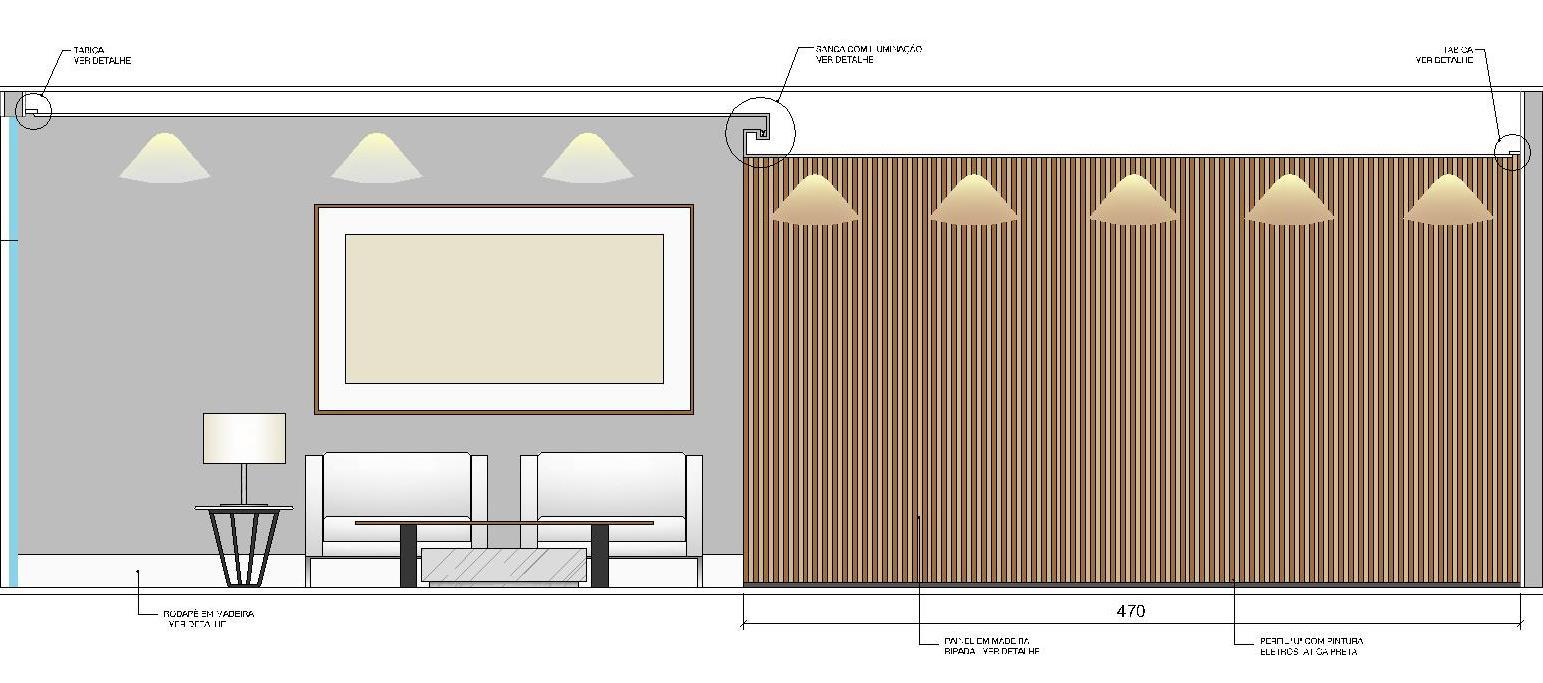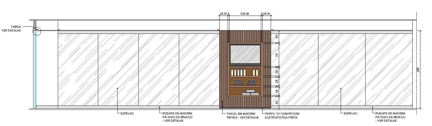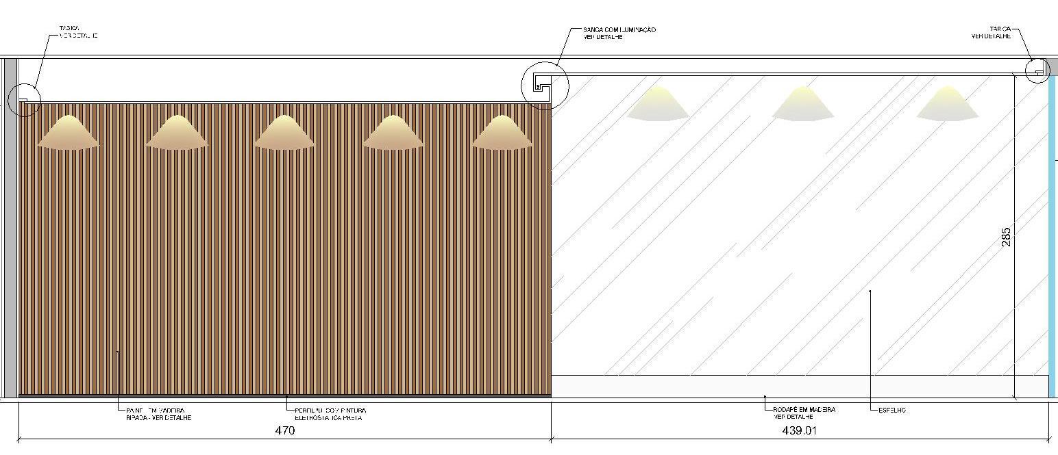 (B)PAINEL Em MDF revestido de lâmina Nogueira Americana (C)ESPELHOS revestido de espelho cristal prata 5mm polido e lapidado colado na alvenaria RODAPÉ