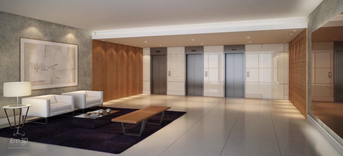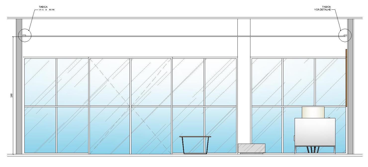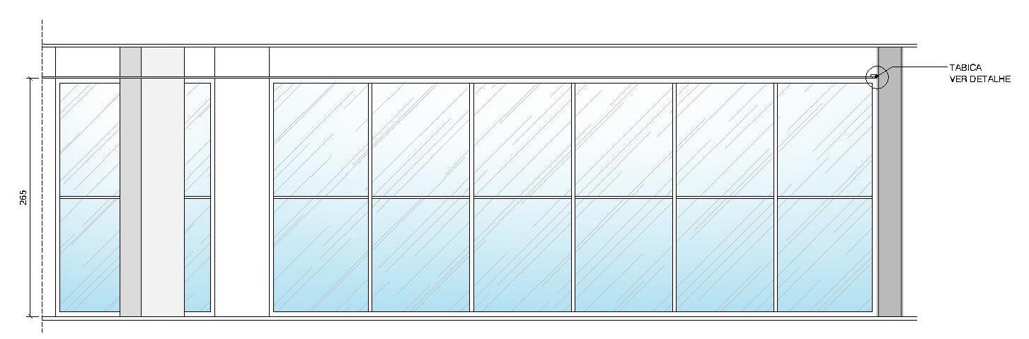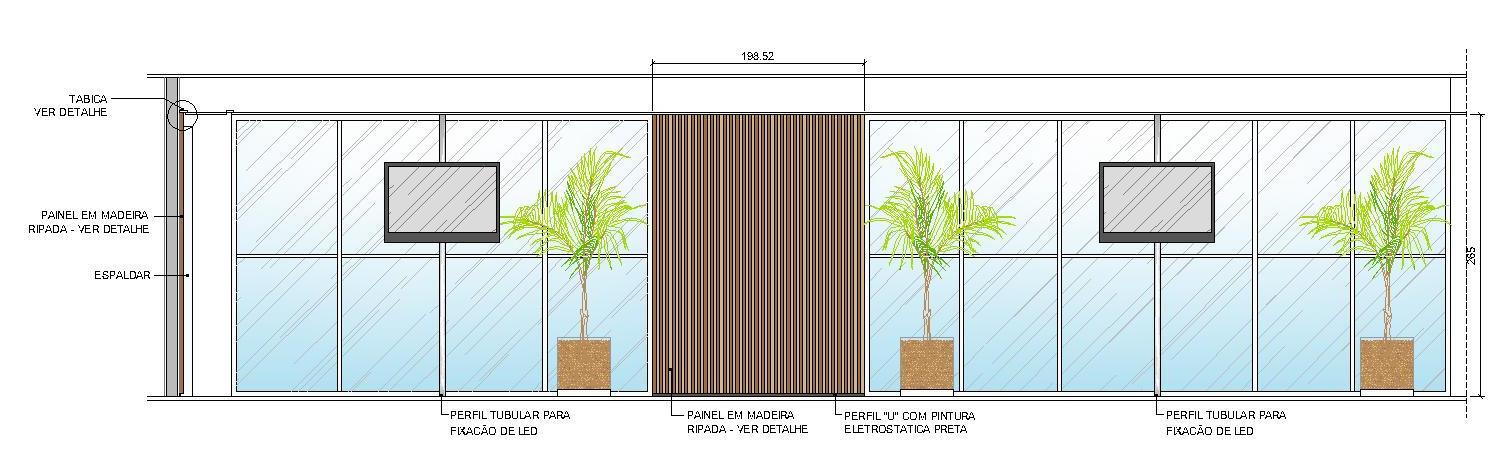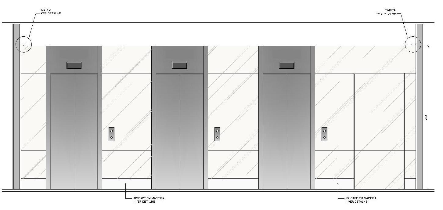(C)PAINEL Em MDF revestido de lâmina Nogueira Americana (D)FACE DOS ELEVADORES revestido de vidro cerigrafado branco, 5mm colado na alvenaria (E) ESPELHO cristal prata lapidado polido 5mm colado em alvenaria RODAPÉ