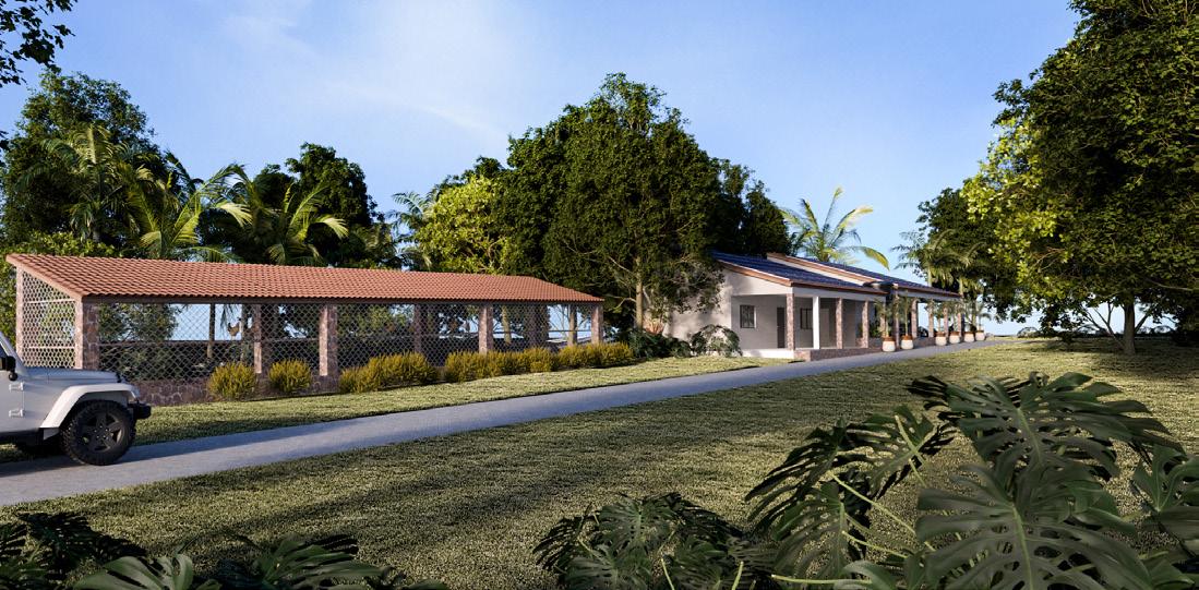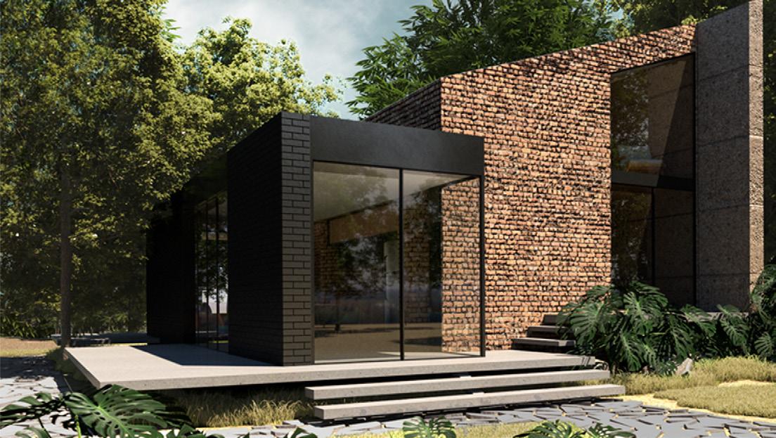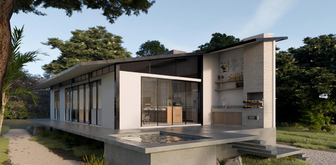 Uma casa de final de semana para receber amigos e ser a futura residênci da família. Um pavilhão abriga a área íntima e outro a área dos hóspedes, ambos são conectados pelo pavilhão social onde estão as áreas de serviço, social e de lazer. A casa é suspensa e possui um extenso lago acompanhando todo o perímetro do alicerce. Foram utilizadas pedras locais, aço nas estruturas e telhas termoacústicas acompanhadas de placas fotovoltaicas. Paredes de vedação feitas com taipa de pilão, biodigestores para tratar águas cinzas e uma cisterna para armazenar águas pluviais. No paisagismo flores, hortas, pomar e mata nativa compõem harmoniosamente a área externa que é circundada por uma pista de corrida.
