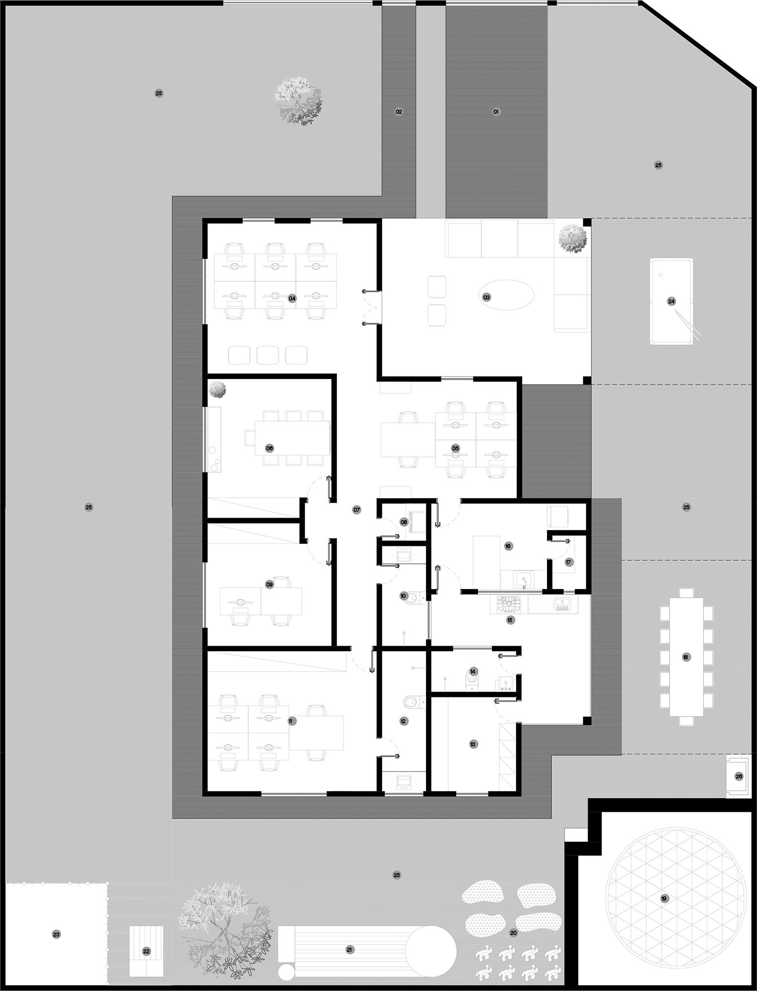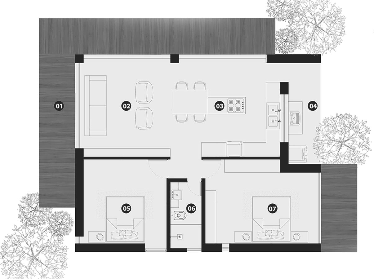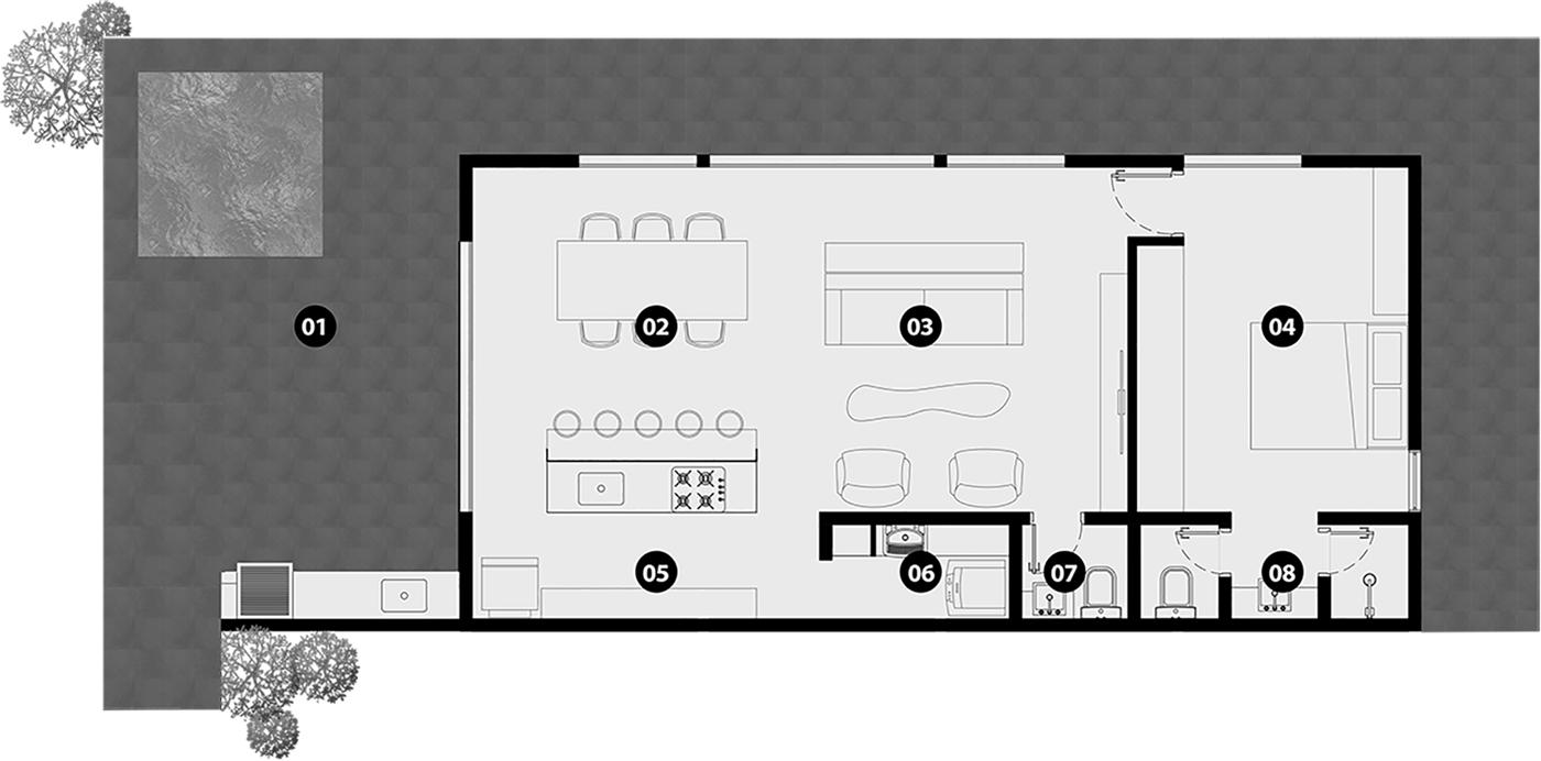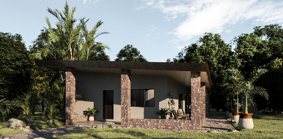 Casa térrea prevendo o uso de materiais que contribuam com o conforto térmico interno, como pedra e tijolos de solocimento. Apresenta aberturas na coberta, para captação e exaustão de ar, promovenod resfriamento interno. A edificação conta com diferenciais como um pátio interno criando uma área de lazer central ligando os setores íntimo, social e de serviço, além do benefício térmico e apelo estético.