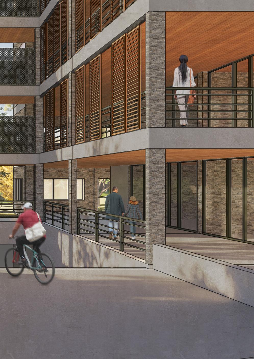 The combination of white brick cladding, sunshades, wooden floors and ceilings, together with moss green paint, results in a balanced and inviting aesthetic. These carefully chosen materials and colors aim to provide a pleasant visual and sensory experience for the building’s occupants, creating a welcoming, integrated and aesthetically appealing environment.