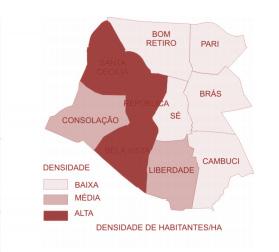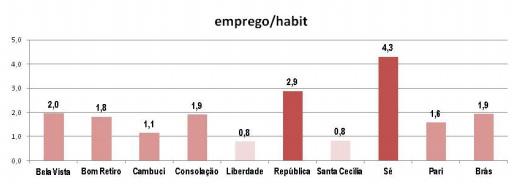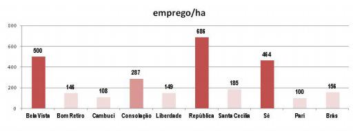 Analisando a média de habitantes por hectare do município de São Paulo - 74 hab/ha - percebe-se que as maiores densidades populacionas se concentram nos distritos de Santa Cecília, Consolação, Bela Vista, Liberdade e República. No distrito de Santa Cecília, é possível identificar a necessidade da implementação de mais serviços que gerem emprego, pois, é um dos distritos centrais que apresentam uma baixa densidade de empregos por habitantes e por hectare.