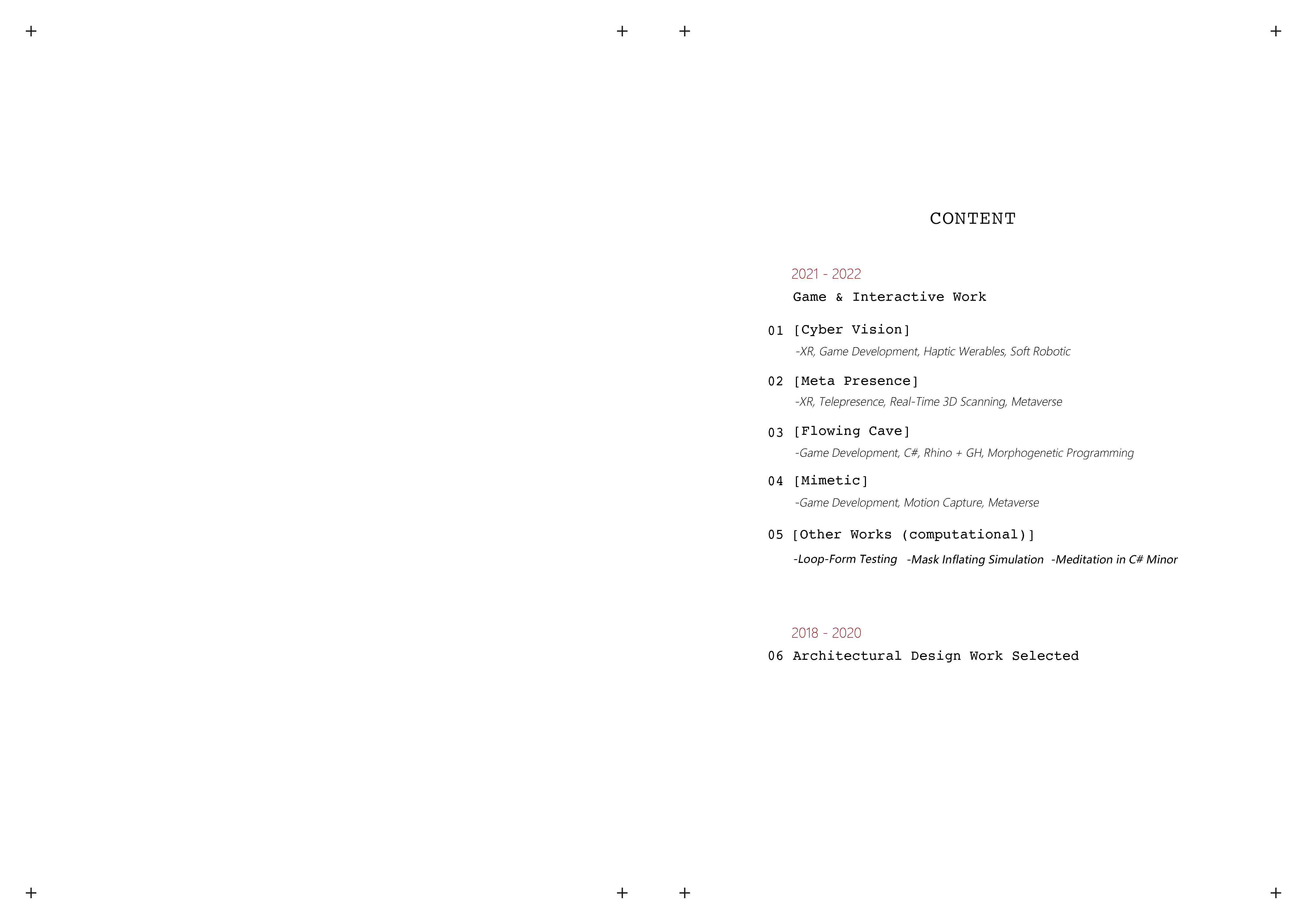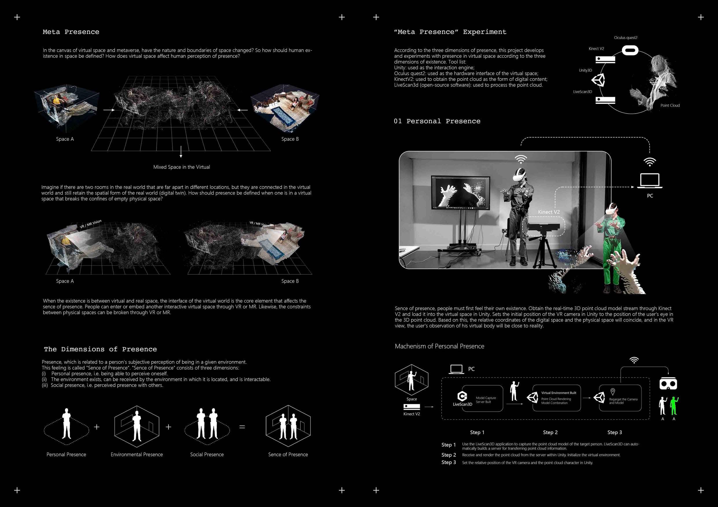to the three dimensions of existence. Tool list: Unity: used as the interac ion engine; Oculus quest2: used as the hardware interface of the vi rtual space; Kinec t V2: used to obtain the point cloud as the form of digital content; LiveScan3d (open-source software): used to process t he po in t cloud.