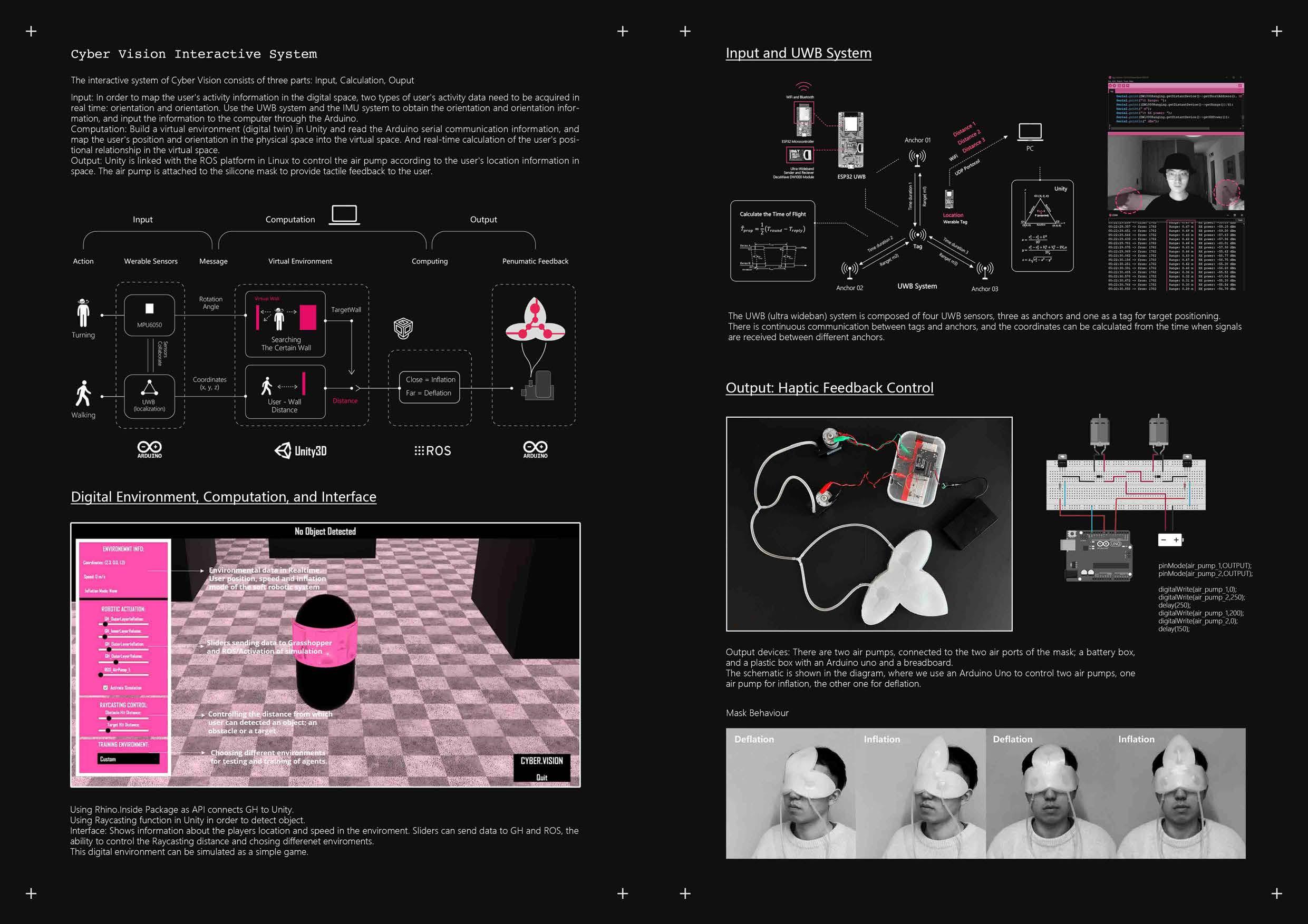 in ter act ive system of Cyber Vision consists of three parts: Input, Calculation, Ouput Input: In order to map the user's activity in formation in t he digital space, wo t ypes of user's activity data need to be acquired in rea t me: orientation and orientation. Use the UWB system and he IMU system to obtain the orientation and orientation informat ion, and inpu t t he in format ion to the computer t hroug h the Arduino. Computation: Build a vi rtual environment (digital t win) in Unity and read the Arduino serial communication information, and map the user's pos it ion and orientation in he physical space into the vi rtual space. And real-time calculation o f the user's posit ional relationship in the vi rtual space. Output: Unity is linked wi t h the ROS platform in Linux to control the air pump according to the user' s location information in space. The air pump is attached to the silicone mask to pro vide tact ile feedbac k to the user. Input Action Werable Sensors T • MPU6050 Turning 111 1 L-. ' • 1' UWB (localization) Walking 00 ARDUINO Me ssage Rotation Angle Coordinates (X, y, Z) Computation Virtua En v ironm e nt ·:--- , ---• I_ Sea rching The Certai n Wa l •--- •l " User -Wal Distance TargetWall -1 _,,. Unity3• Di ital Environment Com utation and Interface No Object De tected Using Rhino.Inside Package as API connects GH to Unity. Using Raycasting function in Unity in o rder to detect object. Output Computing Pe numatic Feedback e ,,------------- y_ Close nflation rS°J Fa Deflation _____________ ,,. ~------------" :::ROS 00 AROUINO Interface : Shows in formation about the p laye rs loca ion and speed in the enviroment. Sliders can send data to GH and ROS, the ability to control the Raycasting distance and chasing differenet enviroments. This digital environment can be simulated as a simple game. In ut and UWB S stem Calculate the Time of Flight Y,OU•<•••n •-••-•••Yo Y•••• os,n,U,JSJ -> !<0<0: 1111 ur.g•: o.o" RX-"' -si.:O <Sa.. os,21,n 1S1 ·> t,o:o, 11,2 R,.r,9 Q.O:,. It..: pc, -S9 lQ d!n os,u 29 SH -> tto:o: n12 11..&~• o.H,. ltX pea.-.., -s1 o ,u;, os,22,2~.tn -> f<<:<11 1111 11..&•~• o.u ro: p,o1tu, -S7.H = os,22,n.H: ·> !<o:a, 1712 II..&•.~·· Q.H" ltX -(0,0l db os,n,n.ns -> :,.,,,., 1111 11..&"9•= o.o,. l<X po,,or, -57. ,i ,ta, os,u,it.?11 •> 1,co: 2 ••"'l•= o.H i,x -ss.:2 d?D ·> !<_, JJll R•r>'l•• o.u J.X peo,·uc -s .n d!n 05:22:JO,lH ·> f< 1711 hr19 0,47 J.X p,;,,.., ·Sl,H d!n OS,2i:JO Hl ·> h«a: 1112 U""•' Q.H II;<-~• ·$$,JI 4?11> os,u,N.Jh •> !<O:,:,.I l.lll it.,.,,.._., ~-H.. l<X -~, to ·> fr.-, 17 1 ll£"'1•• 0.)t ?.X p,:-,M<i ·SS.51 d?lo 05,n,10.nt -> !r«:>: 17 2 1>-1r.9•• o.u,. ~,x P<>'.,.r, 05,n,,o iu -> !re,:,, Pll 1t.t-r.1•• o ,i,. l<X Anchor 02 UWBSystem os,1~1)1 lH •> fr=: Pll ~•n1•• <> 1<X _r, -SS.S~ 4:l<o os,n,n.151 •> fr=, 1112 t.n9•• o.n" ,.x -"' -s~.10 = The UWB (ultra wideban) system is composed of four UWB sensors, three as anchors and one as a tag for target positioning. There is con t inuous communication between tags and anchors, and the coordinates can be calculated from the time when signals are recei ved between different anchors. Out ut: Ha tic Feedback C ,----- antral • t r~~ ::~ ,, - •• , - 1 ,.:::=: J: ff rt in:',M,:: • Output devices: There are wo air pumps, connected to the t wo air ports of the mask; a battery bo x, and a p las t ic bo x wi th an A rduino uno and a breadboard. The schema t ic is shown in t he diagram, whe re we use an Arduino Uno to control t wo air pumps, one air pump for inflation, the other one for deflation. Mask Behaviour Inflation pinMode(air pump 1 OUTPUD; pinMode(air=pump) OUTPUD; digitalWrite(air pump 1,0) digitalWrite(air- pump- 2,250); delay(250); -digitalWrite(air pump 1,200); digitalWrite(air- pump- 2,0); delay(150); -JK JK JK JK JK JK JK JK JK JK JK JK JK JK JK JK
