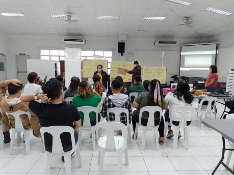 SR Field Officers from CC8, Estrella Fernandez (top left) and Christopher Rocamora (top right) performing a mock orientation on Child Safeguarding