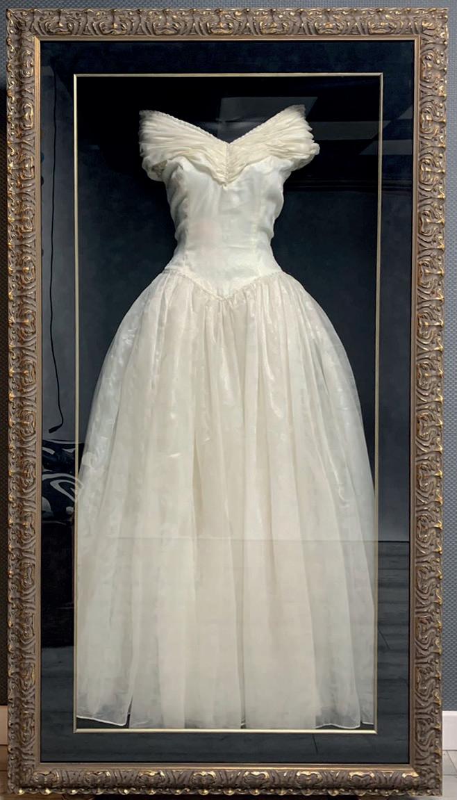 Declan was actually asked by a few of his customers if he framed wedding dresses: “I never say no to anything! I decided to look into it, and found this dress hanging in an antique shop. I got it and decided to make it into a showpiece for the shop.” It took almost two days to complete, and the final framed piece sits at 5ft tall, so working with heavy jumbo glass and large mouldings was a challenge in itself. They have used a Larson-Juhl Dresden slip moulding and a Prague moulding to create this beautifully ornate frame, finished off with black suedette mount for the backing.