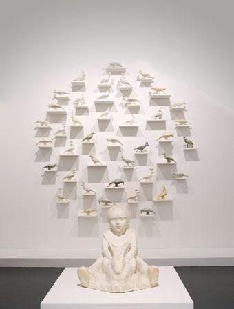 De même, L’Enfant au lapin ouvre l’imaginaire à toute une faune que l’on retrouve dans les contes et que Violaine Laveaux s’est efforcé d’explorer : des oiseaux notamment dont elle réalise de circulaires compositions, ou les lièvres et les loups alignés le long du mur ; des robes surtout, celles que l’on suppose aux princesses des bois dormants ou des bijoux, grâce auxquels certaines femmes des temps jadis se laissaient apitoyer par le Monstre. Un peu par humour, un peu par attachement à des souvenirs d’enfance, Violaine Laveaux aime tantôt associer les choses (un végétal et un animal par exemple) tantôt les transformer, autant dire les pétrifier, douce émule de la gorgone donc. Les branchages relaient la porcelaine de manière à sculpter dans le vide ou à dessiner de façon naturelle et aérée. Le parcours se déroule en cinq étapes : des impressions de Méduse sur bande de tissus dans la première salle. Le thème de l’enfance dans la seconde avec en particulier un buste d’enfant et des références aux contes. L’adolescence ensuite avec la découverte du corps et des différentes façons de la parer (bijoux et vêtements). Le thème si essentiel des métamorphoses, qui résonne avec l’obsession bien moderne pour
