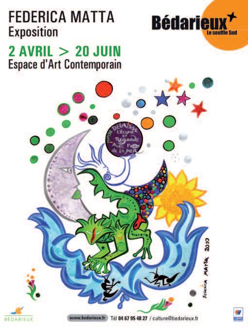 Federica va aujourd’hui investir les trois salles de l’Espace d’Art Contemporain de ses peintures et sculptures. Son parcours s’illustre à travers de nombreuses expositions dans le monde entier: elle travaille le dessin, la sculpture, la peinture, l’illustration et l’écriture.Federica Matta a grandi dans une famille d’artistes nomades et elle s’est nourrie de toutes les cultures au cours de ses nombreux voyages, en particulier en Amérique Latine. Elle est une artiste authentique qui témoigne, à travers sa démarche de création, que la peinture est aussi un moyen d’agir au quotidien sur le monde. Son parcours d’artistes l’amène à créer des lieux de rencontres, des aires de jeux dans les villes et des espaces de paix, comme à Santiago du Chili«La Plazza Brazil» vingt-deux sculptures-jeux, à Saint-Nazaire «Le voyage de la Sirène» raconte son histoire aux habitants de la ville, à Lisbonne«Le jardin Atlantique», à la station de métro «Parques», au Japon «Pim-Pam-Pom», à Montpellier au Collège Arthur Rimbaud, ou encore en Iran avec «La caravane des Poètes», œuvres collectives créées avec les enfants d’Hispahan à Téhéran.Federica Matta intervient également dans l’illustration de livres, comme dans le livre de Nahal Tajadod «Sur les pas de Rûmi», poète mystique du 12e siècle. Ainsi, dans le cadre de l’exposition de Federica Matta, le spectacle «Chants d’amour de Rûmi» de Nahal Tajadod et de Jean-Claude Carrière sera présenté à la salle de la Tuilerie, le samedi 15 mai à 17h. L’œuvre de Federica Matta est universelle. Elle manie les couleurs et les formes comme un manège qui délivre un message poétique de paix et d’amour. Du 2 avril au 20 juin à l’Espace d’Art Contemporain à Bédarieux. Tél. 04 67 95 48 27.