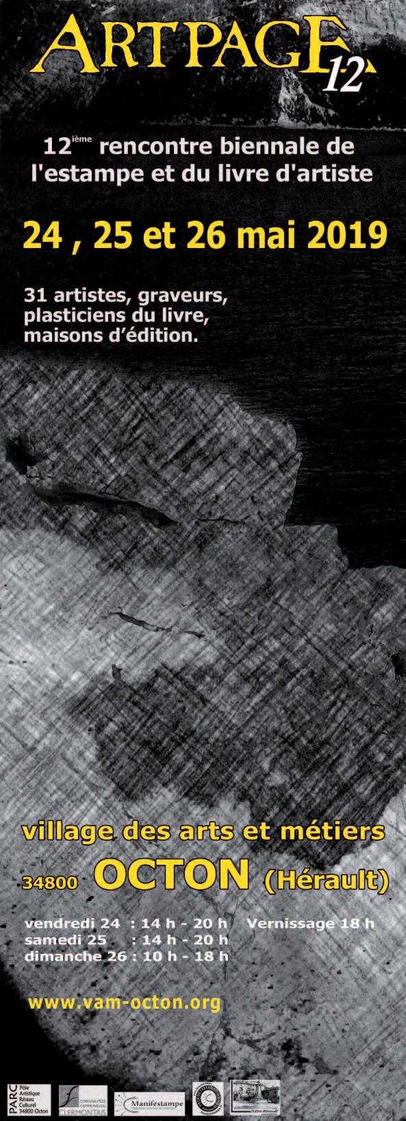 Du 24 au 26 mai s ’ ouvre la douzième édition du festival Artpage, Biennale à Octon, portée par l’association P A R C Tout près du lac du Salagou, voilà une occasion toute trouvée de découvrir et redécouvrir des artistes graveurs et autres éditeurs régionaux, nationaux et même inter nationaux Artpage Biennale est installé en deux lieux : d’abord au sein de la salle polyvalente de la commune « les Fontanilles » , vaste et lumineuse Mais également dans la salle d’exposition du Village des Arts qui propose toute une collection d’oeuvres d’artistes exposés depuis des années à Octon et des ateliers d’artistes résidents En tout, ce ne sont pas moins de 31 exposants qui ont été sélectionnés pour animer les trois jours de festivités qui se veulent bien sûr tour nés vers l’échange, le partage et la rencontre autour de l’estampe au sens lar ge du ter me