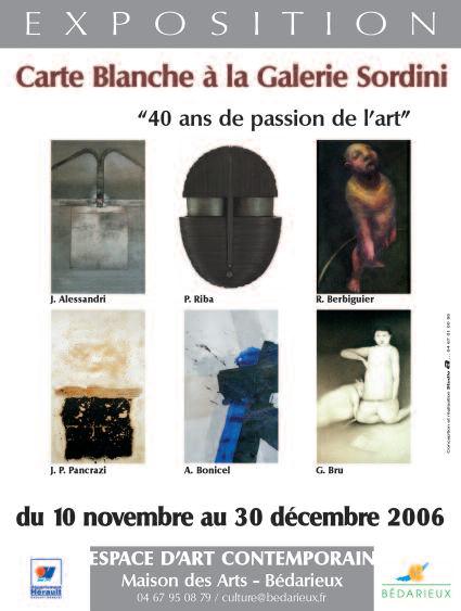 ,Francette et Jean Sordini sont des acteurs de la vie culturelle marseillaise importants ; qui pourrait en douter après 40 années passées au service des artistes et plus largement de l’art ? Avoir, ouvrir, tenir une galerie, avec tant de constance, contre vents et marées… Une passion pour les créateurs vivants, un goût pour des œuvres aussi variées que ces temps chaotiques proposent, une disponibilité très grande pour recevoir, écouter, comprendre et montrer ; c’est là une vocation, une vie de partage et de rencontres. Nous verrons ici des coups de cœur, mais pas de la marchandise, plutôt des liens entre les êtres, des propositions plastiques, des rêves étalés au grand jour pour notre questionnement, notre plaisir… L’exploration d’un univers plastique parle certes des créateurs, mais ô combien plus de ceux qui les ont réunis. Et nous serions en droit de penser du coup que c’est une exposition Sordini dont il s’agit, tant ces œuvres parlent pour eux-mêmes et d’eux-mêmes. Seront présentés : Joseph Alssandri, Raymond Berbiguier, Alain Bonicel, Georges Bru, JeanPaul Pancrazi, Pierre Riba. Jusqu’au 31 décembre à l’Espace d’Art Contemporain, Musée de Bédarieux. Tél : 04.67.95.08.79.