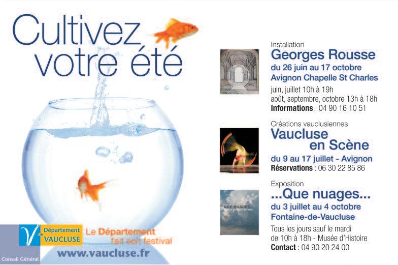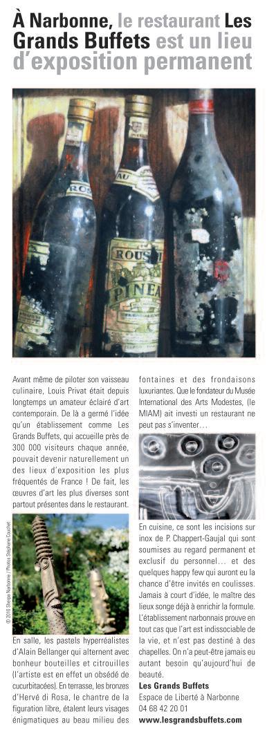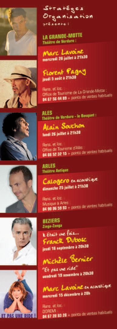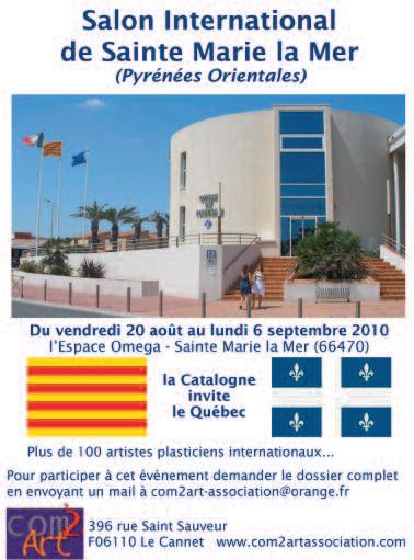 l’art-vues • page cent-deux • juin - juillet Pierre Noguès et Françoise Muletdu 4 juin au 14 juillet au Caveau Saint-Julien à CournonsecTél: 04 67 85 30 48 Parlez-moi des Couleursdu 22 juin au 3 juillet à la Médiathèque Max Rouquette à BédarieuxTél: 04 67 95 99 70 2 dans, 2 horsdu 24 au 27 juin au Village des Arts et Métiers à OctonTél: 04 67 96 08 52 Madeleine Molinier-Sergiodu 4 juin au 26 juillet à la Galerie Dock Sud à SèteTél: 04 67 74 00 77 Kathy Bassaget et Anne Batai du 18 juin au 5 septembre à la Galerie Terre d’Art à SèteTél: 04 67 53 66 28 Thomas Vernyjusqu’au 26 juin à la Galerie Hélène Trintignan à MontpellierTél: 04 67 60 57 18 Romaric Chachayjusqu’au 26 juin à la Fondation du Pioch Pelat à Castelnau-le-LezTél: 04 67 79 41 11 Henrietta Stuartjusqu’au 31 août à l’Agence Galerie à Clermont l’HéraultTél: 04 99 91 44 44 1ères Rencontres des Espaces Publics Numériquesle 22 juin dans les locaux de Kawenga à MontpellierTél: 04 67 06 51 66 Photographies de Laurence Phillippondu 11 juin au 1er juillet à la Galerie l’IconoGraph à AnianeTél: 06 64 19 81 82 Eve Maillot et Hélène Agnieldu 19 juin au 1er août à l’Eglise Saint-Etienne d’Issensac à BrissacTél: 04 67 06 96 04 Lili Comejusqu’au 30 juin à la Galerie de l’Ecusson à MontpellierTél: 04 67 52 80 14 Dany Méricdu 21 juin au 12 juillet à la Salle d’exposition (Capitainerie) de La Grande MotteTél: 04 67 56 42 00 Photographies de Christelle Espinassedu 19 juillet au 10 septembre au Paris-Méditerranée, à la Décoratrice, l’Echappée Belle à SèteTél: 04 67 74 97 73 Exposition collectivejusqu’au 30 juin à la Galerie N à MontpellierTél: 06 50 81 96 66 Alejandro Dos Santosjusqu’au 3 juillet à la Galerie le Lac gelé à NîmesTél: 04 66 36 76 49 Christelle et Michel Berberianjusqu’au 30 juin à l’Open Galerie à Vers-Pont du GardTél: 09 61 28 48 66 Piet Mogetdu 12 juin au 29 août à la Galerie du Tenydior à Collioure Tél: 04 68 56 92 25 J. Monory avec N. Daubanes, A. Malagrida, D. Morindu 26 juin au 5 septembre à la Forteresse de Salses à Salses-le-ChâteauTél: 04 68 38 60 13 Carolina Ferrer & expo collectivedu 2 juillet au 26 septembre au Centre d’art contemporain à PerpignanTél: 04 68 34 14 35 Laurette Atrux-Tallau et Natacha Lesueurdu 27 juin au 3 octobre à la Chapelle des Archevêques à NarbonneTél: 04 68 90 30 53 I. VanLamsweerde, V. Matadin et E. Van Lamsweerdedu 12 juin au 4 septembre au Centre d’Art et de Littérature à MontolieuTél: 04 68 78 96 29 Perspectives sur Patrimoine bâtidu 5 juillet au 16 octobre à la Bastide Saint-Louis à CarcassonneTél: 04 68 10 24 30 Cécile Hesse et Gaël Rommierdu 20 juin à fin novembre à l’Ancienne Maison consulaire à MendeTél: 04 66 49 85 93 Vincent Alran jusqu’au 20 juin à la Galerie Ducastel à Avignon Tél: 04 90 82 04 54 Livres Autrement (livres d’art) du 6 au 27 juin à L’Atelier Archipel à Arles Tél : 06 21 29 11 92 Rencontres photo d’Arlesdu 3 juillet au 19 septembre au Parc des Ateliers à ArlesTél: 04 90 96 76 06 In Situ 0.5jusqu’au 15 juillet au Mas du Grand Arbaud à ArlesTél: 04 90 49 89 10 Z.A.E. l' Audacieuse 34480 Magalas Tél.04