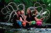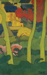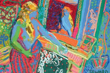 • Florence Aubin et ses forêts de troncs suspendus, troncs vivants de peintures regroupées entre elles, ses tentures multicolores, tables de banquet et robes chamarrées, offrent une parfaite géométrie de tranches de vie, de couleurs.