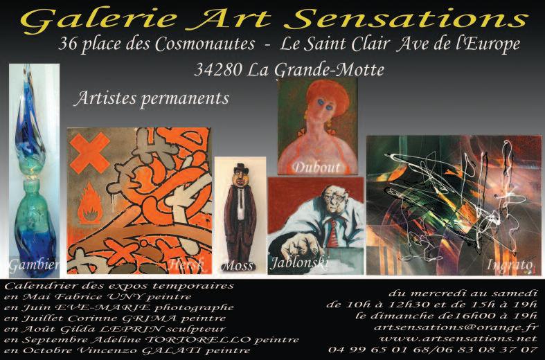 ,Un an et demi après son ouverture la Galerie Art Sensations à La Grande-Motte fait un premier bilan. D’abord teinté de morosité dans cette période délicate de «crise », le moral revient pourtant au beau fixe, comme le printemps annonceur de renouveau, pour sa directrice. Des idées nouvelles telles que des expositions pendant la saison (de mai à octobre), à raison d’un artiste « invité » par mois, des peintres, photographes, sculpteurs, et aussi des ventes d’objets de décorations en extérieur devant la galerie pour animer et attirer l’attention des nombreux passants. Un nouveau venu aussi dans la galerie, le verrier d’art Gambier qui présente de magnifiques verreries (flacons, vases, poissons, etc.). Bien entendu, les artistes permanents de la galerie sont bien présents : Ingrato, Hersk, Jablonski, Menu, Mimm, Moss. Galerie Art Sensations, Le St-Clair 1- 36, Place des Cosmonautes à La Grande Motte. Tél. 09 65 27 45 86. www.artsensations.net