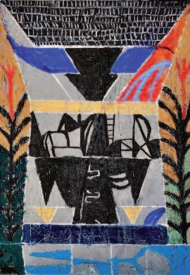 Cet hommage en rend compte et per met de mieux approcher la personnalité de cet original touche à tout dans son intimité créatrice On peut découvrir dans ces collages, gouaches, peintures, mobiles fins et subtils (etc ) en gros ce qui l’intéressait, ce qu’il s ’appropriait pour le développer et meubler son temps libre. Ainsi peut-on repérer çà et là l’influence du théoricien Michel Seuphor et de son intérêt pour Mondrian, celle de Picabia dans ses séries de points, de Hans Arp dans ses for mes rondes, voire même de Matisse dans quelques rares scènes figuratives d’intérieur. Mais ce sont surtout les oiseaux de Braque qui deviennent pour lui un motif récurrent, décliné à l’infini dans les tableaux ou les vitraux Une véritable narration s ’ y fait jour pour peu que l’on sache lire quelque peu le langage des for mes et leur rapport avec nos sentiments On pourrait également aborder cette