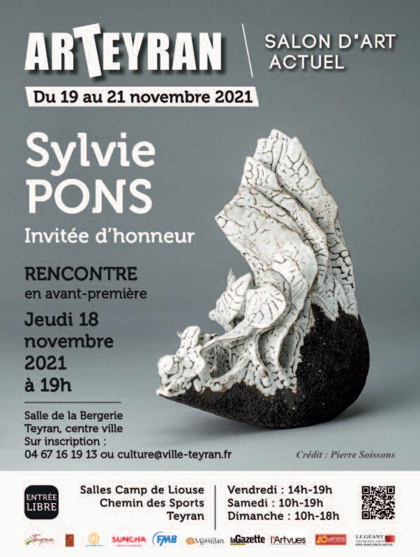 La septième édition du Salon d’Art Actuel Art Teyran aura lieu en novembre Depuis 2014, cette manifestation organisée par le service culturel de la ville de Teyran a pour objectif de promouvoir et de partager les expressions contemporaines de la création L’occasion de découvrir les œuvres de nombreux artistes professionnels du territoire, de la région Occitanie et d’ailleurs Ces créateurs se distinguent par la richesse de leurs travaux (peinture, dessin, sculpture, céramique, photographie) Cette année, la sculpteure-céramiste Sylvie Pons, sera l’invitée d’honneur du salon Un spectacle et des ateliers d’écriture seront également proposés pendant ces trois jours Du 19 au 21 novembre à Teyran (34). Tél. 04 67 16 19 13. arteyran.wor dpress.com