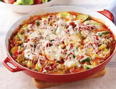 Esparce 1 taza de la salsa para espagueti en el fondo de la sartén; cúbrela con cucharadas pequeñas de la mezcla de ricotta, las verduras cocidas, la salsa para espagueti restante y el mozzarella. Tapa la sartén. Cocina la lasaña a fuego medio-bajo durante 20 min. o hasta que esté completamente caliente. Retírala del fuego y déjala reposar durante 5 min. antes de servir.