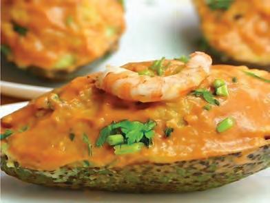 Cortamos los aguacates por la mitad y extraemos la pulpa, con cuidado de no dañar la cáscara, pues la necesitaremos para después. Picamos un poco la pulpa con un cuchillo, para que sea más fácil de triturar después, y la añadimos en un bol. Añadimos el zumo del limón ahora, para evitar que se oxide y trituramos bien con un tenedor. Preparamos una salsa rosa. Para ello, mezclamos el ketchup con la mayonesa. Si quieres la salsa más clara añade mayonesa. Si por el contrario, la quieres más oscura, añade kétchup. Puedes hacerla un poco a tu antojo. Incluso añadir un poco de brandy que le da un toque brutal. Ahora, a la pulpa del aguacate de antes, le añadimos la cebolleta picada y las gambas cocidas, reservando unas pocas para decorar al final. Añadimos también los palitos de cangrejo en rodajitas y una parte de la salsa rosa que, ayudará a que ligue y dará mucho sabor. Rellenamos las cáscaras de los aguacates con generosidad con este relleno. De tal manera que hasta nos sobrarán cáscaras. Metemos en la nevera para que asienten bien una vez estén rellenos. Untamos un poco la superficie de los aguacates rellenos de gambas y palitos de cangrejo con más salsa rosa. Encima, colocamos una o dos de las gambas enteras que habíamos reservado y servimos.
