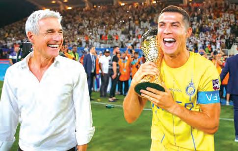 A sus 38 años, CR7 ni piensa en el retiro y su espíritu competitivo está muy fuerte. El fuego sagrado lo lleva a seguir rompiendo redes con 20 goles en 25 partidos y el primer título logrado con su club en la Liga de Campeones Árabes es un aliciente. Al luso se le sumó Benzema, que ya marcó 3 tantos en 5 encuentros y hay una expectativa enorme por lo que pueda hacer Neymar, el cuarto futbolista mejor pagado del mundo por detrás de Cristiano Ronaldo (200 millones anuales en el Al Nassr), Karim Benzema (200 millones anuales en el Al Ittihad) y N’golo Kanté (100 millones