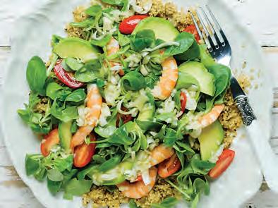 PREPARACION: Comenzaremos hirviendo la quinoa siguiendo las instrucciones del fabricante, pero aproximadamente 15 minutos. Escurrirla y reservarla en un bol. Cocer los camarones, reservarlos. Mientras tanto hacemos el aliño, mezclando el zumo de lima y el chile en copos, el aceite y el sirope de arce. Añadimos la mitad del aliño a la quinoa y agregamos la cebolleta picada, los canónigos, los camarones cocidos, el aguacate en láminas y los tomates cherry partidos a la mitad. Salamos al gusto y echamos por encima el resto del aliño. Espolvoreamos con el cilantro fresco picado. Servimos rápidamente. Con qué acompañar la ensalada al estilo asiático de quinoa y camarones Esta ensalada al estilo asiático con quinoa y gambas podéis acompañarla con un buen vino blanco fresco y afrutado. Al llevar la quinoa, no necesita pan ni otro acompañamiento, ya que es una ensalada de aspecto ligero, pero muy completa.