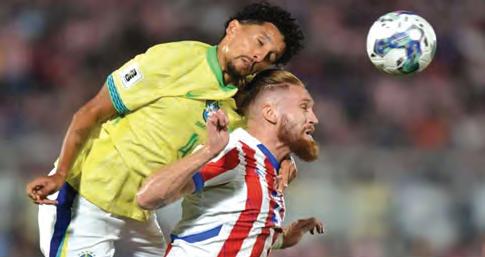 El brasileño Marquinhos y el paraguayo Pitta pelean el balón en lo alto. La Albirroja se impuso con el solitario gol de Diego Gómez, en el estadio Defensores del Chaco de Asunción y se mantiene en zona de repechaje de las EliminatoriaS. Paraguay se encargó de propinarle este martes en Asunción otro duro golpe 1-0 a un Brasil sin ingenio, que juega una de las peores eliminatorias de su historia. El único gol del encuentro fue obra del volante ofensivo Diego Gómez, a los 20 minutos. La Seleçao quedó en un infrecuente quinto lugar de la clasificatoria sudamericana para el Mundial de 2026 con diez puntos en ocho partidos, mientras Paraguay suma uno menos en el séptimo escalón. Paraguay - Brasil 1 - 0 Estadio: Defensores del Chaco (Asun- ción). Árbitro: Andrés Matonte (URU) Go-