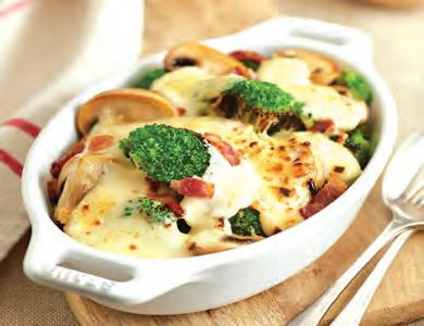 Colocaremos en un recipiente los champiñones con el tocino y el ajo. En un recipiente para horno colocaremos el brócoli, los champiñones, el bechamel y el queso.