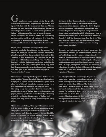 “The view is breathtaking,” Kim says. “The graphics make it look like you’re looking at real life, not a computer screen.” The graphics are one of the most attractive and radical improvements made from the prequel of Skyrim, The Elder Scrolls IV: Oblivion. For Skyrim, Bethesda created a brand new game engine, called the Creation Engine. This new engine allowed Skyrim to apply the technological advancements of