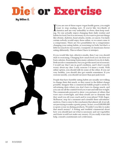 f you are one of those super-vegan health gurus, you might want to stop reading now. If you’re like two-thirds of America and are very unhealthy or obese, then keep reading. No one actually enjoys changing their daily routine and habits for food, but it is necessary if you want to prevent things like obesity, diabetes, heart attacks, stroke, or cancer. I’m fairly certain nobody would enjoy those either, so we must come to a compromise. There are two possibilities for a compromise: changing your eating habits, or exercising (or both, but that’s a little too much for our society). A majority of Americans choose eating differently. This is where I have to interject. If you would like fast, effective results, then I say you should stick to exercising. Changing how much food you eat does not burn calories. Exercising burns many calories if you do it daily. Both involve commitment, but you get the most out of exercise. I would say that I am in good condition, and I don’t exactly worry about my diet. I only exercise 3-4 times a week. With either option, you should still do some of the other. If you eat very healthy, you should also get outside sometimes. If you exercise mostly, you should eat more than just junk food. People that have horrible eating habits are usually not willing to change their diet much, so they resort to the littlest change possible. Imagine this: a commercial fulfills people’s needs by advertising diets where you don’t have to change much, and you can eat all the comfort food you want and still lose weight. The commercials proceed to show you pictures of others that were once overweight, and their results are so dramatic that they send you off your couch and to your phone! Well, EagerMcBeaver, stop for a moment and consider these advertisers’ motives. I have come to the conclusion that almost all, if not all, are just trying to make a pretty penny. In fact, over $100,000,000 is spent a year on dieting products. Wouldn’t you like to make that much money? A boring and truthful commercial about how you should just eat what is necessary and eat vegetables and fruits would not make any money. If you really want diet help, consult a nutritionist; not a television.