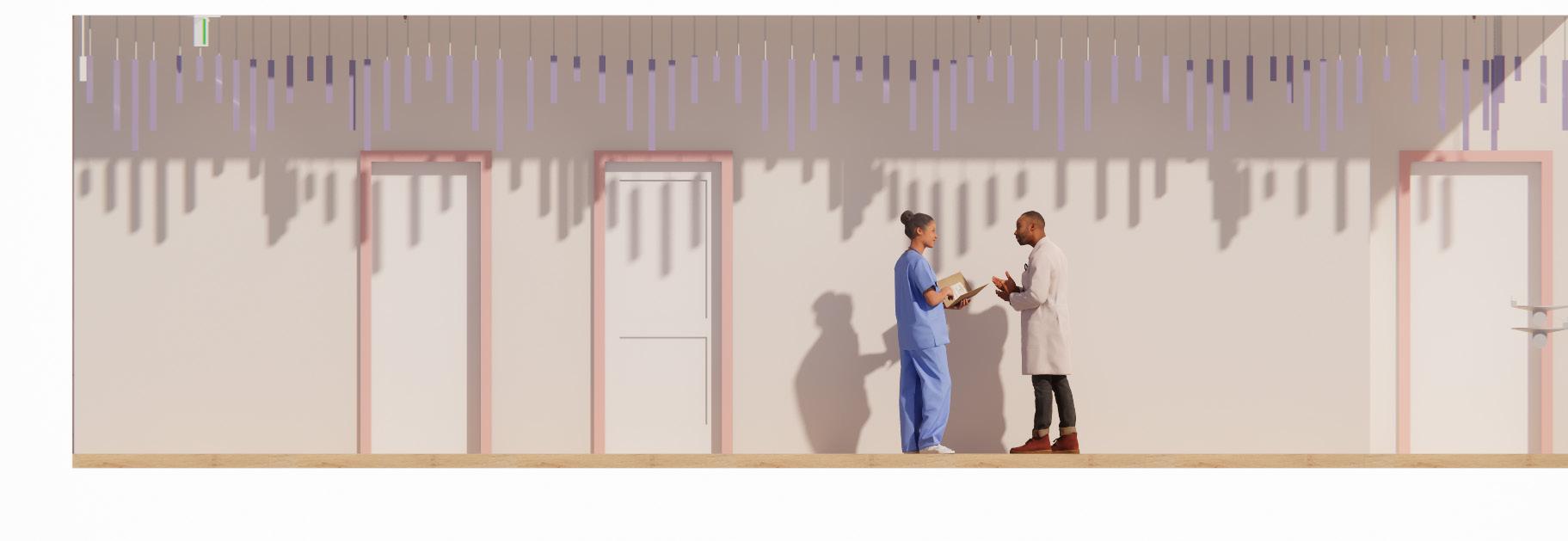 The rod like light fixtures have been placed throughout the space as a means of guiding the user through the space while also removing the cold and sterile feeling typically associated with medical facilities