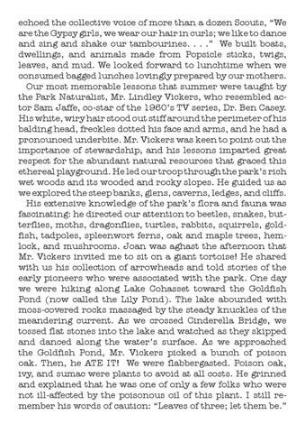echoed the collective voice of more than a dozen Scouts, “We are the Gypsy girls, we wear our hair in curls; we like to dance and sing and shake our tambourines. . . .” We built boats, dwellings, and animals made from Popsicle sticks, twigs, leaves, and mud. We looked forward to lunchtime when we consumed bagged lunches lovingly prepared by our mothers. Our most memorable lessons that summer were taught by the Park Naturalist, Mr. Lindley Vickers, who resembled actor Sam Jaffe, co-star of the 1960’s TV series, Dr. Ben Casey. His white, wiry hair stood out stiff around the perimeter of his balding head, freckles dotted his face and arms, and he had a pronounced underbite. Mr. Vickers was keen to point out the importance of stewardship, and his lessons imparted great respect for the abundant natural resources that graced this ethereal playground. He led our troop through the park’s rich wet woods and its wooded and rocky slopes. He guided us as we explored the steep banks, glens, caverns, ledges, and cliffs. His extensive knowledge of the park’s flora and fauna was fascinating: he directed our attention to beetles, snakes, butterflies, moths, dragonflies, turtles, rabbits, squirrels, goldfish, tadpoles, spleenwort ferns, oak and maple trees, hemlock, and mushrooms. Joan was aghast the afternoon that Mr. Vickers invited me to sit on a giant tortoise! He shared with us his collection of arrowheads and told stories of the early pioneers who were associated with the park. One day we were hiking along Lake Cohasset toward the Goldfish Pond (now called the Lily Pond). The lake abounded with moss-covered rocks massaged by the steady knuckles of the meandering current. As we crossed Cinderella Bridge, we tossed flat stones into the lake and watched as they skipped and danced along the water’s surface. As we approached the Goldfish Pond, Mr. Vickers picked a bunch of poison oak. Then, he ATE IT! We were flabbergasted. Poison oak, ivy, and sumac were plants to avoid at all costs. He grinned and explained that he was one of only a few folks who were not ill-affected by the poisonous oil of this plant. I still remember his words of caution: “Leaves of three; let them be.”