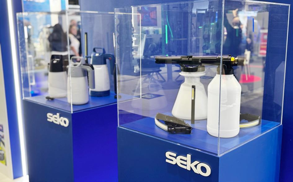 The vibrant SEKO stand hosted a selection of automotive care solutions including detergent dosing systems, foam sprayers and side channel blowers alongside essential accessories such as microfibre cloths and spray bottles.