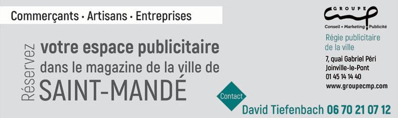 DIRECTEUR DE LA PUBLICATION Julien Weil DIRECTEUR DE LA RÉDACTION Matthieu Stencel RÉDACTION Isabelle Fouché CONCEPTION GRAPHIQUE Valérie Besser VISUELS Mairie de Saint-Mandé / Mathieu Génon / Thierry Guillaume / Adobe Stock IMPRESSION Imprimeries Morault RÉGIE PUBLICITAIRE CMP Régie publicitaire 01 45 14 14 40 david@groupecmp.com NOMBRE D’EXEMPLAIRES 14 500 Dépôt légal à parution