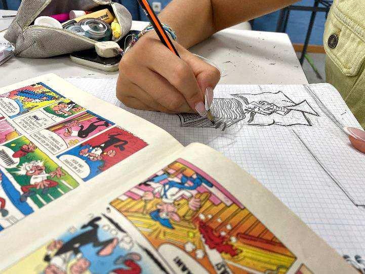 Citamos a la flamante autora del diseño del logo de este curso, María Rivas, para que converse con Paula Fernández, ilustradora jefa deCJR,mientras esta empieza a prepararla viñeta de estenúmero, homenajealos álbumesdeMortadeloyFilemón.Durantemásdeunahora,ambasconversaronsobre los encargos para el periódico, sus inicios en elmundo delarte y todoslos secretos del logo 2023/24.
