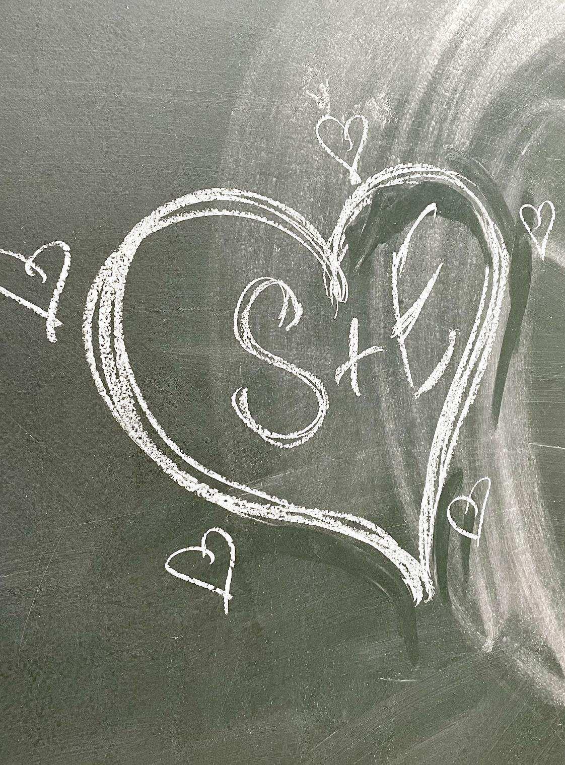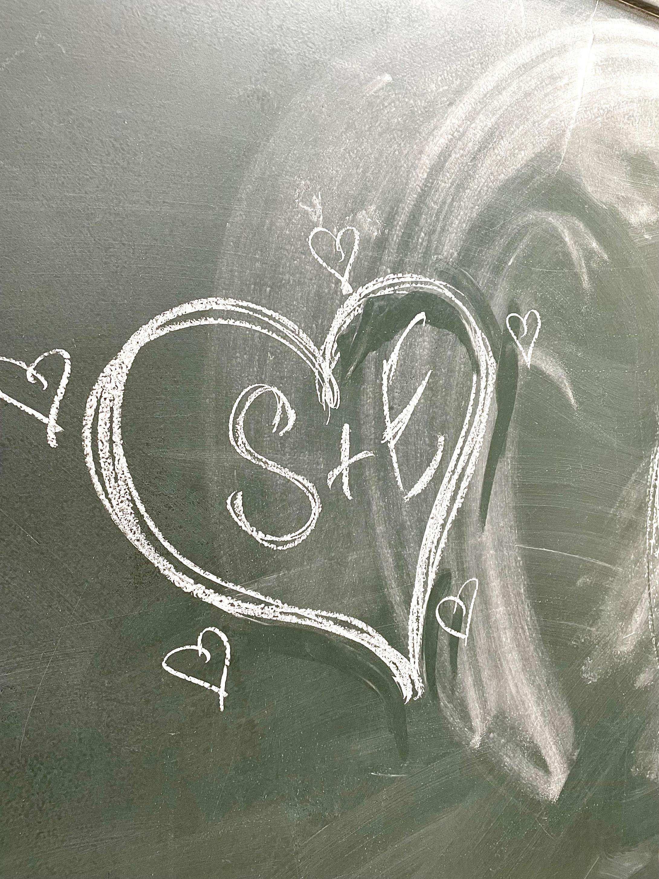 Tres parejas, tres corazonesde tiza en la pared y seis iniciales dentro.
